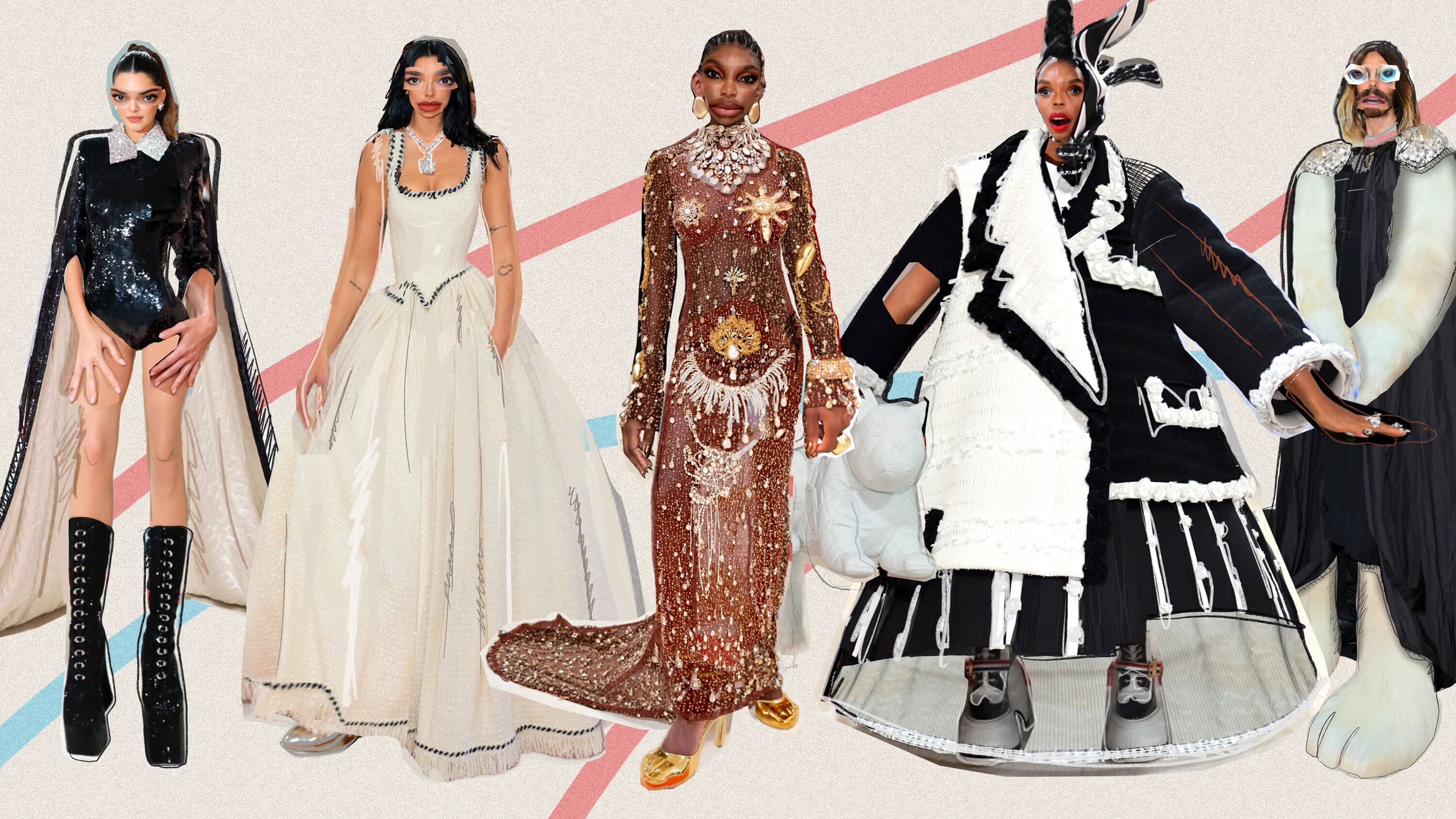 Last night’s Met Gala theme, Karl Lagerfeld: A Line of Beauty, offered guests a few subjects for interpretation in the realm of red carpet ensembles and their corresponding beauty extensions. Guests explored the fashion designer’s sartorial legacy in one way or another. We saw these themes draped on Penélope Cruz and Nicole Kidman in the form of archival CHANEL or Maude Apatow’s modern interpretation of one of Karl’s old Chloé looks. Others reimagined his iconic uniform. Think Usher in Bianca Saunders (leather gloves—check!) or Janelle Monáe’s multi-step-reveal Thom Browne ensemble. Or, and here we pause for dramatic effect, attendees could riff on Karl’s feline significant other: his 11-year-old Birman cat, Choupette. And riff they did, whether that’s Keke Palmer invoking Choupette blue for her cape or Jared Leto’s The-Masked-Singer-esque giant catsuit. The latter was not of the Catwoman variety—though perhaps this will inspire a reboot—but instead furry, supersized outerwear that he stepped out of mid-catwalk. Below, we’ve asked artist Austin Call to reimagine the looks of those we feel took the biggest sartorial risks—and reaped the rewards.