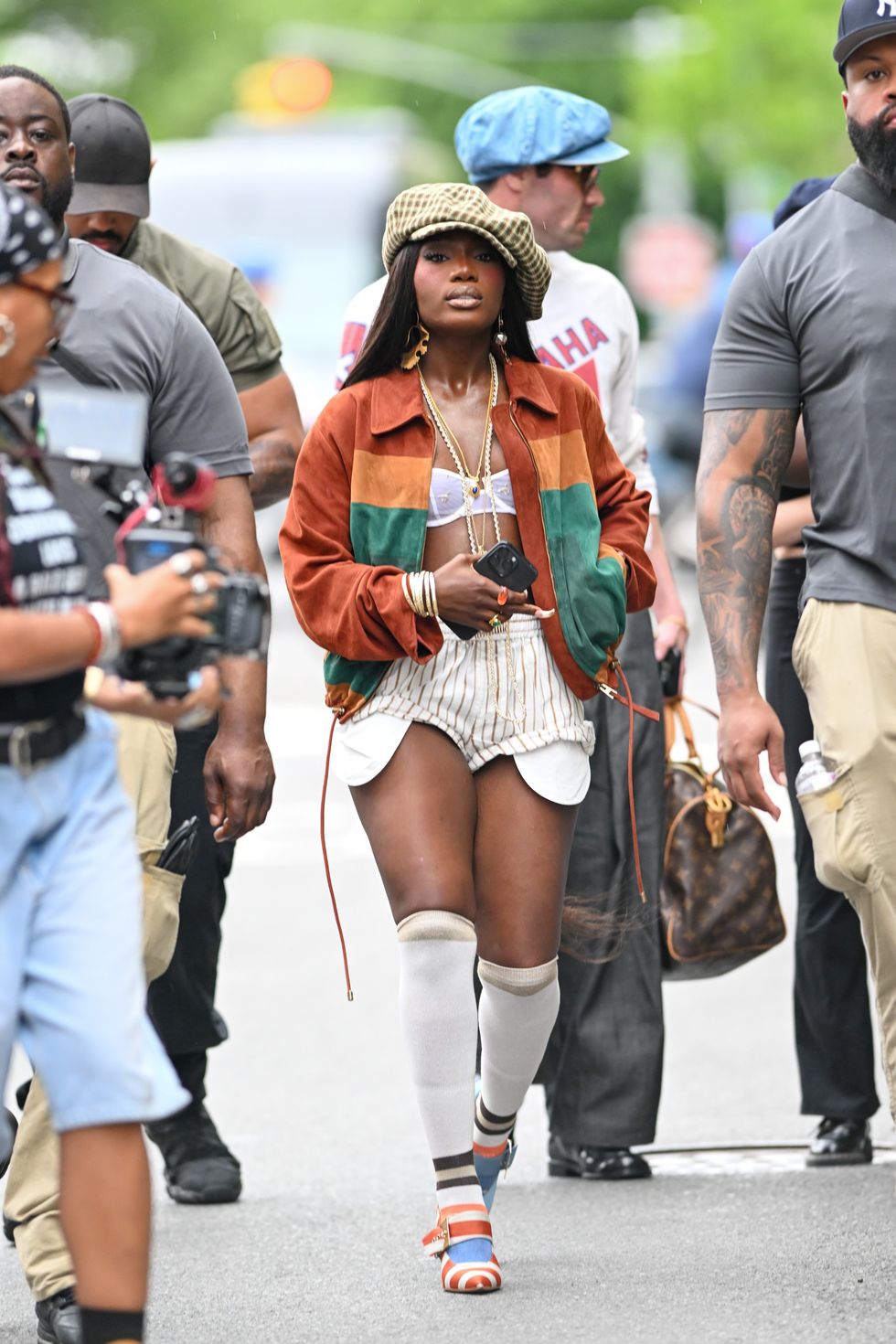 Doechii arrived at a fan meet and greet in a Loewe bomber, which she coordinated with her Tanner Fletcher shorts and Chloe Gosselin shoes.