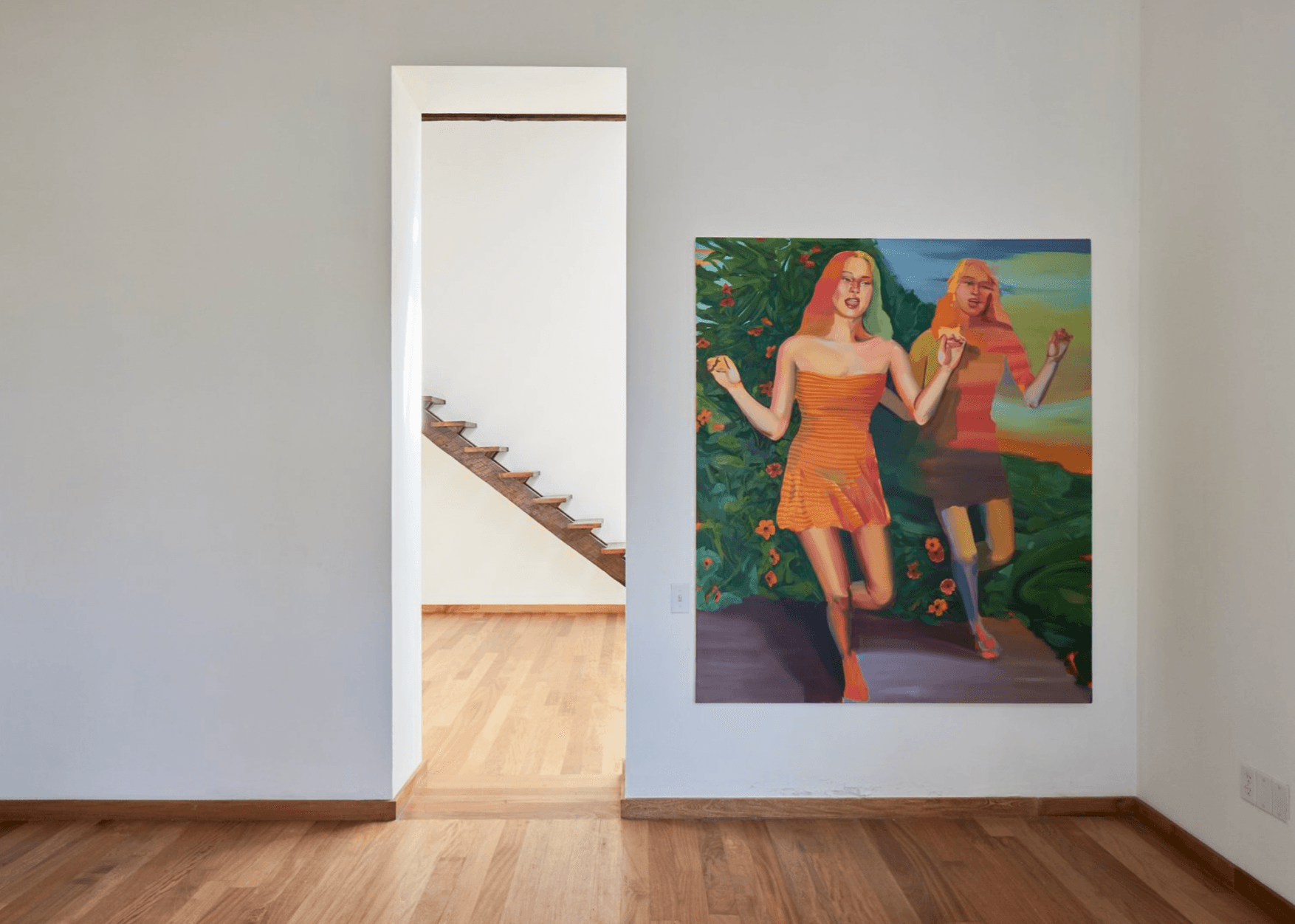 Courtesy of NARANJO 141, Mexico City and Fredericks & Freiser, New YorkNARANJO 141, having opened their gallery in Santa Maria la Ribera close to a year ago, presents "Here, Elsewhere," a joint exhibition featuring the new paintings of Anna Kenneally and Lizzy Lunday, London-based and Brooklyn-based artists, respectively. Following their inclusion in a New York group show at Fredericks & Freiser Gallery in 2021, this exhibition marks their first formal showcase in Mexico. Themed around the virtue of being present and grappling with the lack of familiarity with a new city, the works explore the challenges of remaining mindful when disconnected from the familiar. Through improvisational energy, the artists' compositions depict characters navigating uncertain terrain, drawing on archetypes that traverse epochs. Both artists converge in a relentless pursuit of the present, addressing uncertainties in identity and location throughout their compelling work. The works are shown with a residential backdrop; a traditional rowhouse.