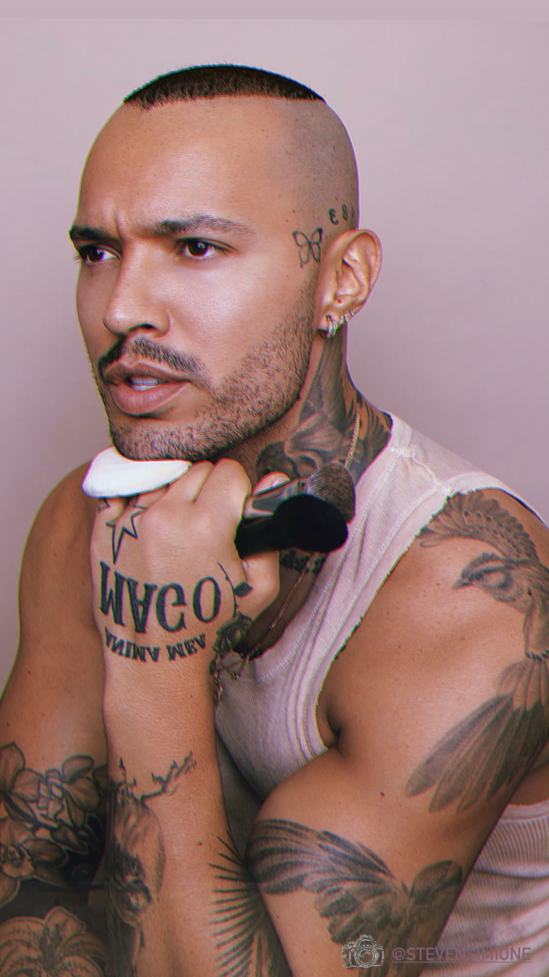 Owing his first real introduction of makeup to his aunt Robyn, the regional director for Mary Kay, he considered her office his personal beauty library. “The training manuals and testers were piled up in her office, and I couldn’t resist them,” says Anthony. It was this support from his circle around him that ultimately opened up the doors to his time at MAC Cosmetics. He assisted makeup legends like Dame