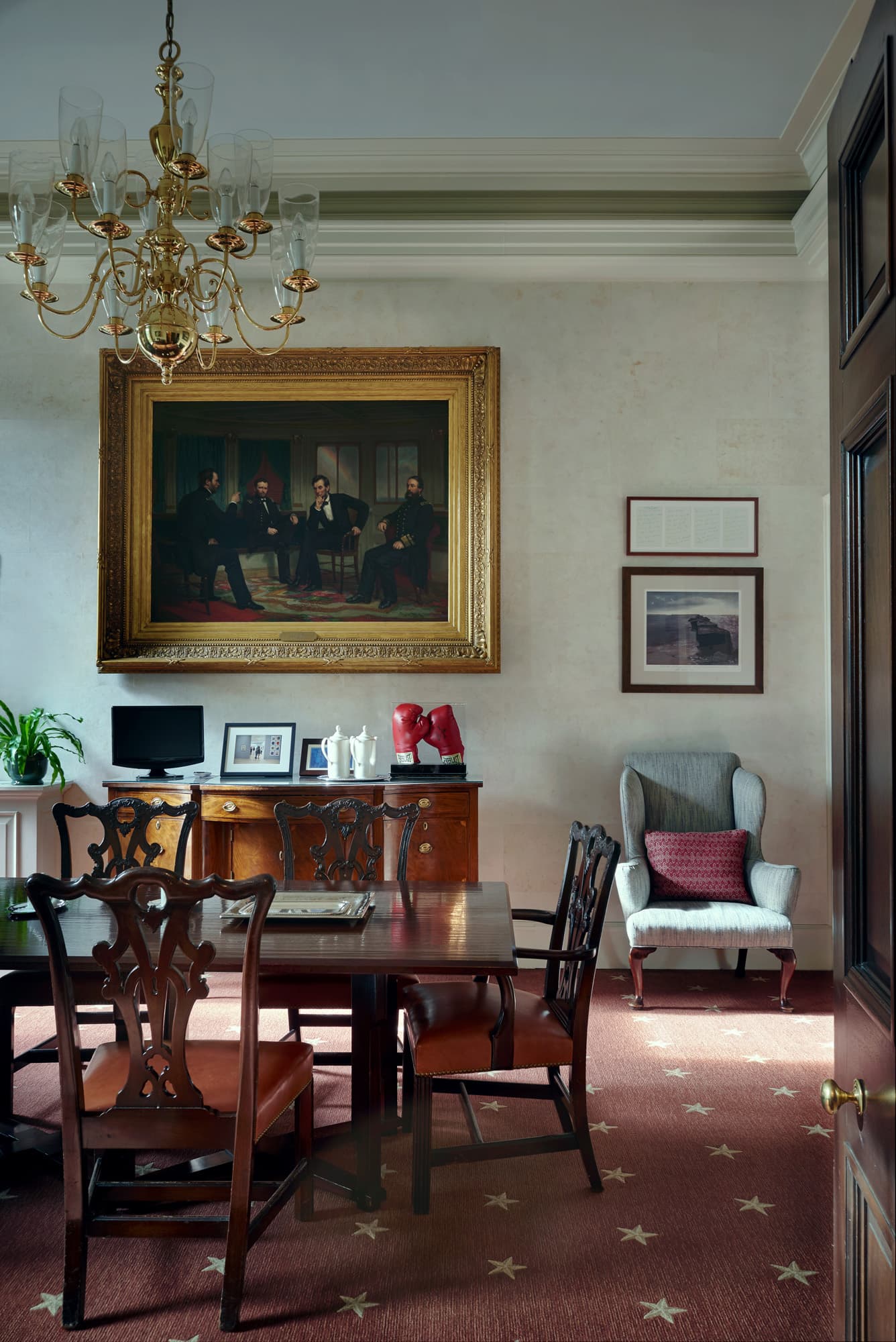 “It was very much the same idea of just being really mindful of function and use and what had come before. Look, it’s a space that you can never win. Fifty percent of the people are going to think it’s too traditional. Fifty percent of the people are going to think it’s too modern. It’s just always, always going to be challenging. Half the people are going to hate it, half the people are going to like it. I think you just go into it understanding that over time, people’s perception of the space becomes classic. Your eye kind of gets used to it. It was about doing something that was special for this president. It has to sit in the building in a way that is really comfortable and appropriate.”