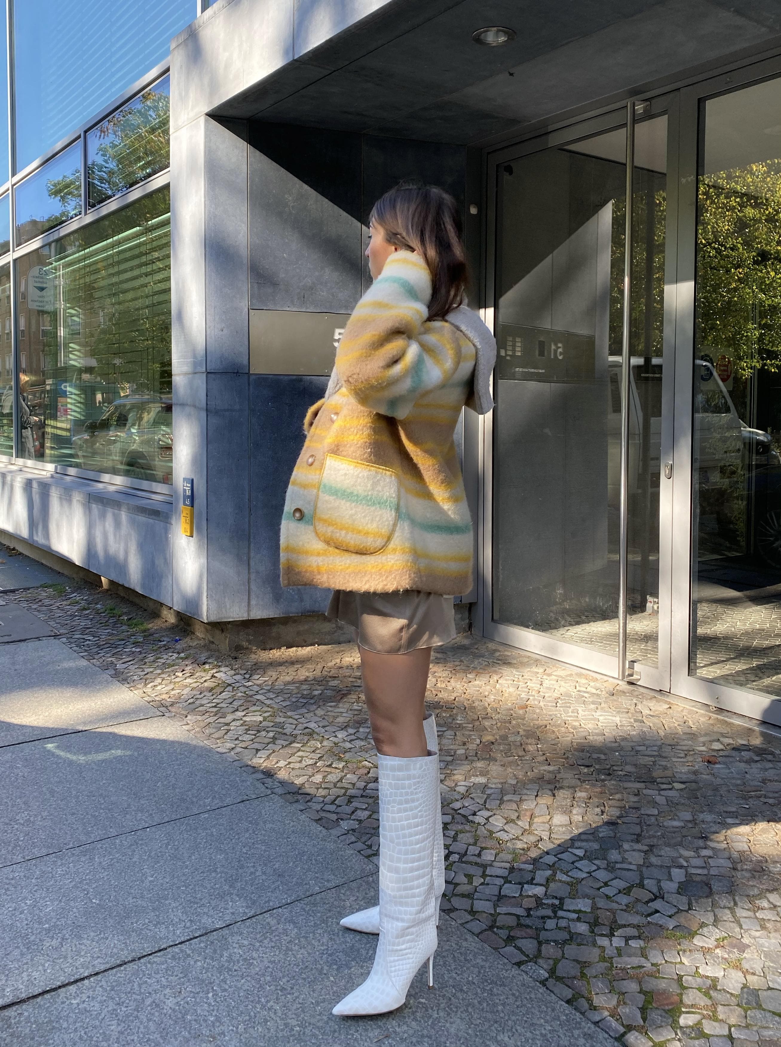 “I love how I worked these neutrals together for a clean but playful look—with my trademark mini in the winter touch. Most of all, I was thrilled with how my rushed, sloppy self-blowout attempt resulted in these soft waves. I’ve never been able to redo this hair again!”
