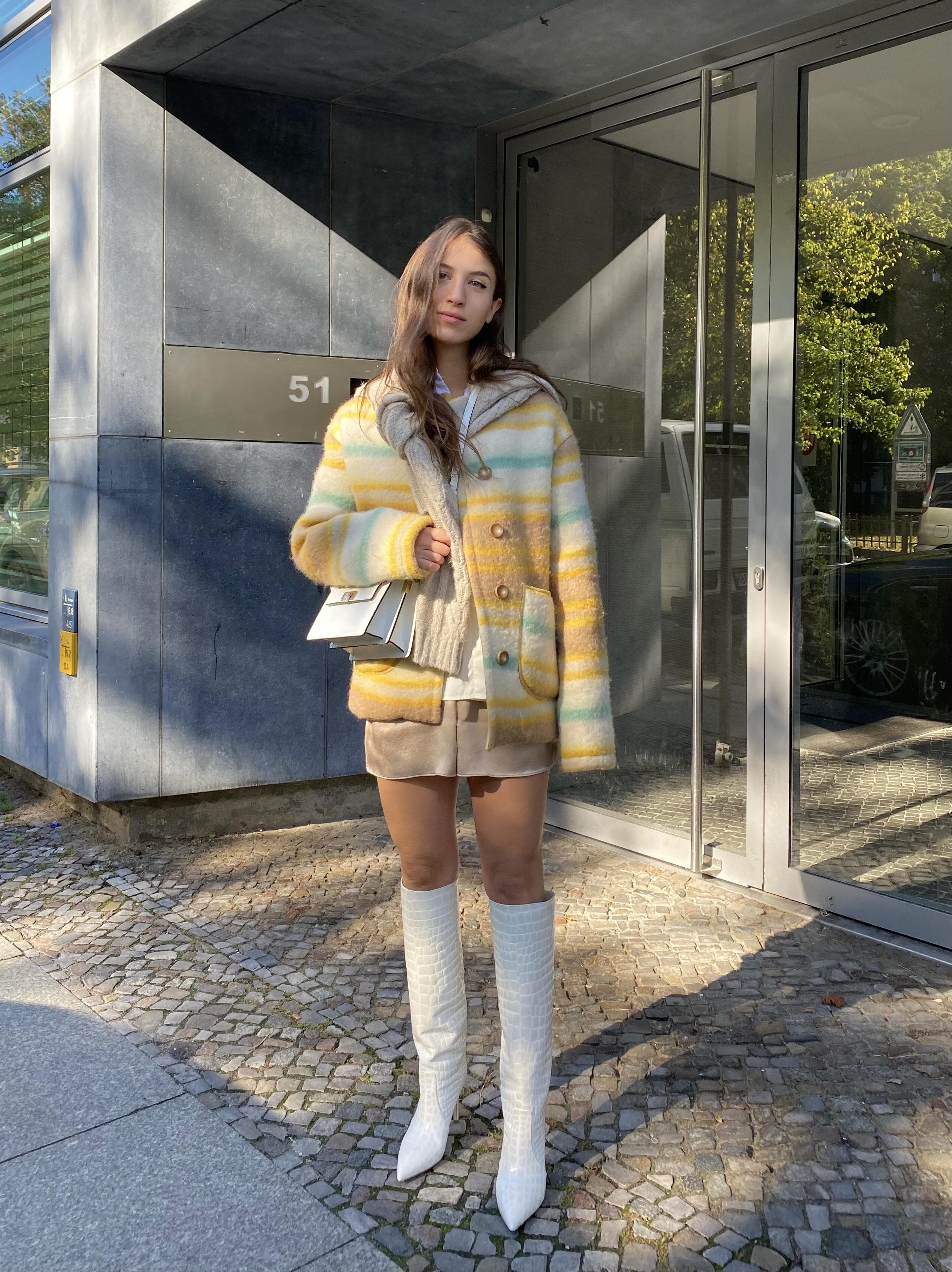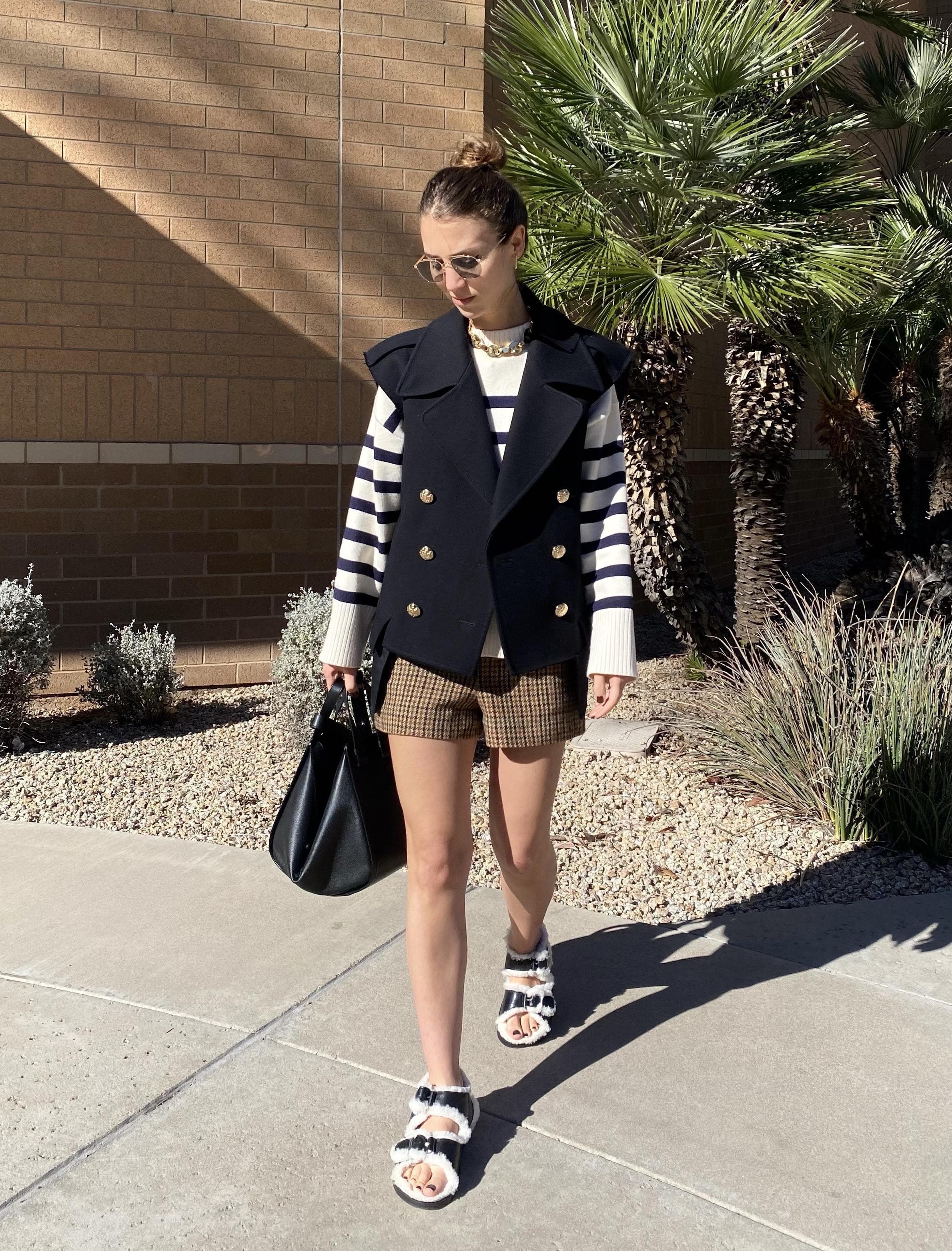 “I had just purchased these silk shorts and wasn’t about to wait six months to wear them. I actually prefer them styled for winter than in a more predictable summer look. And, I think I pulled them off!”
