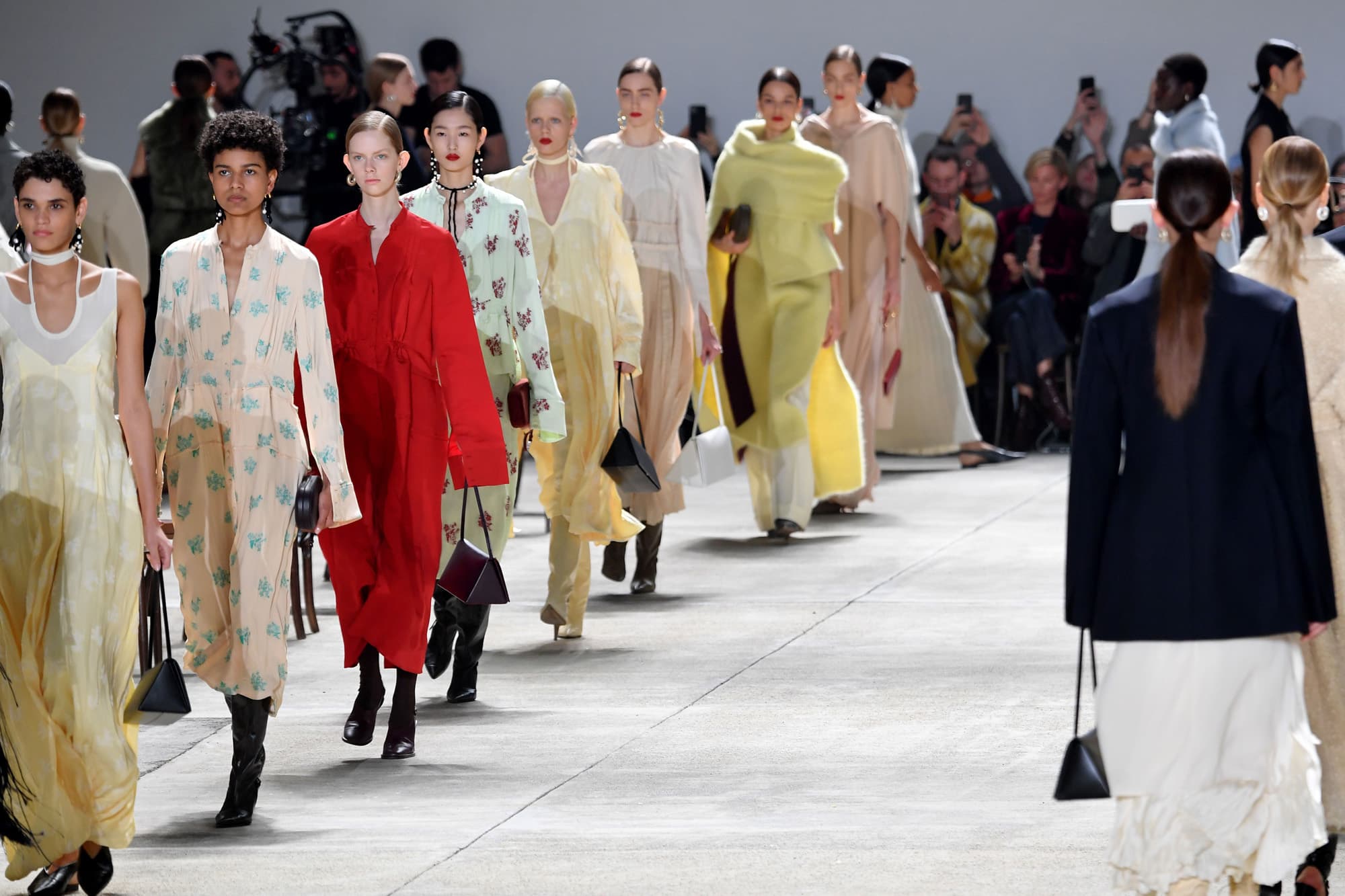 Photo: GettyThis season, Miuccia Prada reiterates one of the central tenets of her oeuvre: Femininity and strength are not mutually exclusive. The designer’s stunning sixty-look collection reappropriates conventional tropes of feminine style including flowy fringe, jet beading, cinched waists, sheer layers, and artful florals, portraying them as dominant themes. The range of sensible silhouettes is animated by sprightly colors including azure, poppy red, lilac, and canary yellow. Leave it to Prada to make everyday glamour feel anything but indulgent.