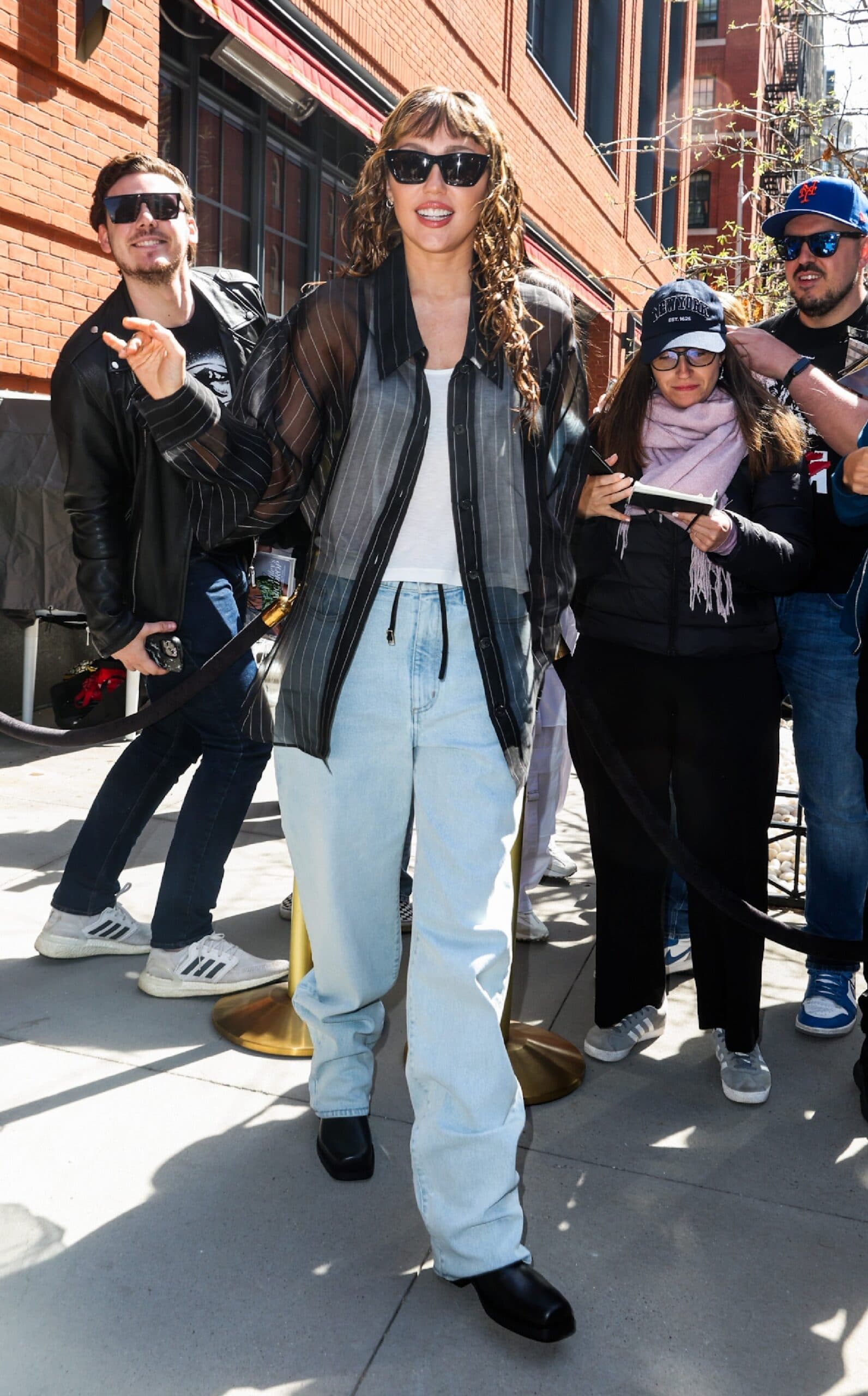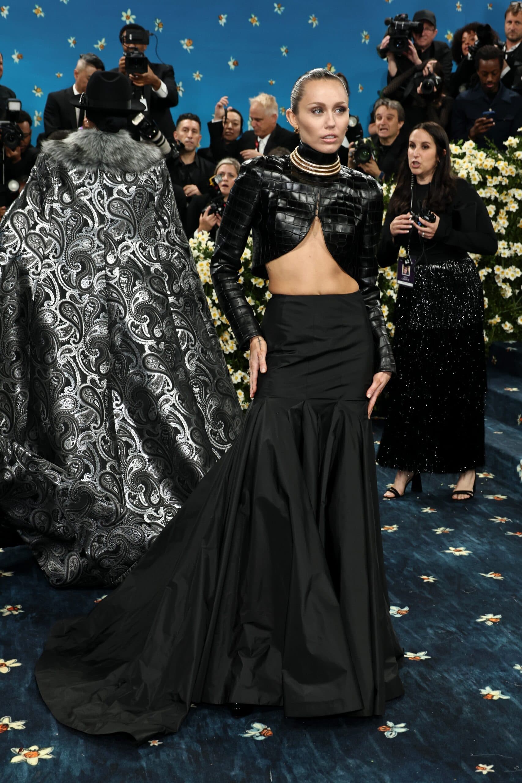 Photographed leaving her hotel in New York over the past week, Cyrus has emerged in Tom Ford suits, sleek jeans-and-bomber-jacket combos, oversized leather jackets, and breezy cotton button-downs. At the Met Gala this past Monday, Cyrus attended in a two-piece Alaïa look with a black taffeta skirt, crocodile-embossed cropped leather jacket, and gold hoop necklaces, an air of quiet confidence about the singer as she ascended the Met steps.