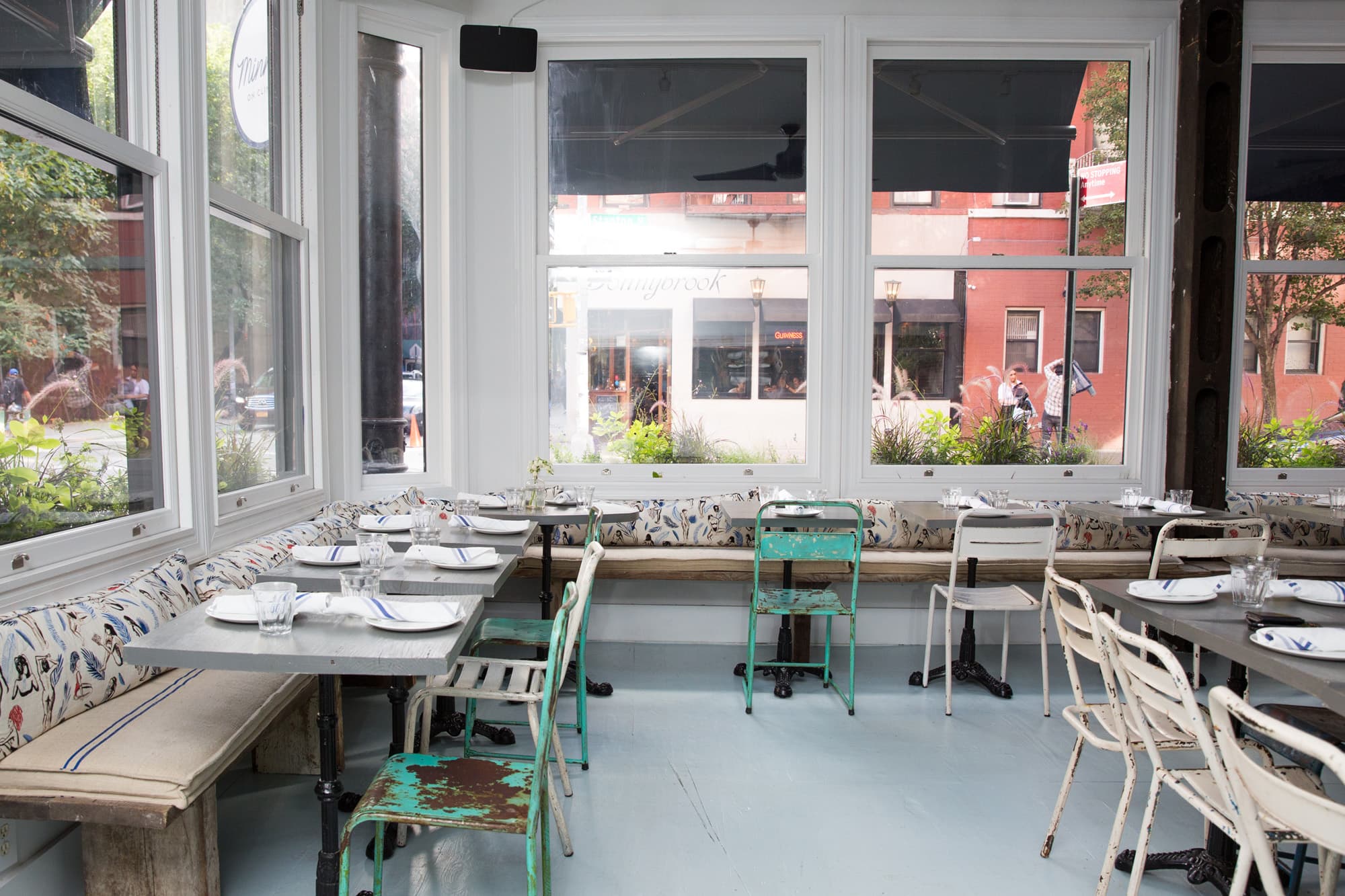 I left PR and I went on a soul searching trip around Italy, Greece, and France,” explains the native New Yorker as we post up at the intimate bar at the back. Two full walls of windows, flanked by exposed brick, peer onto bustling Clinton Street outside. Custom embroidered cushions rest on the wooden benches around the perimeter. Everything is punctuated by a showstopping portrait of two Lolita-esque girls at the back. Millie laughs, assuring me before that neither of the larger-than-life girls is her. “I made a series of lists of what the next path was going to be, and a restaurant was something I always thought about. It seemed like a much later in life venture, but, no time like the present.”