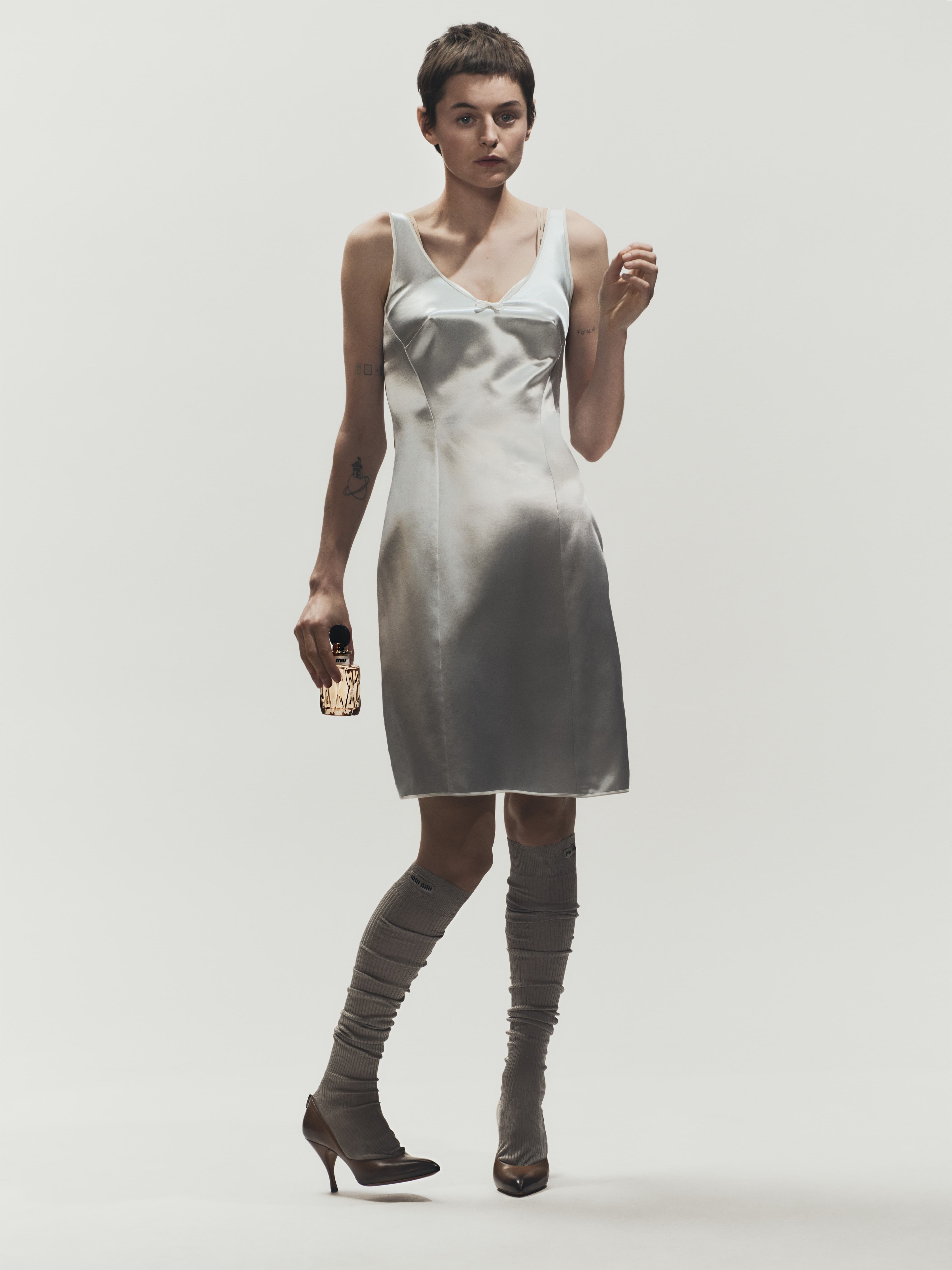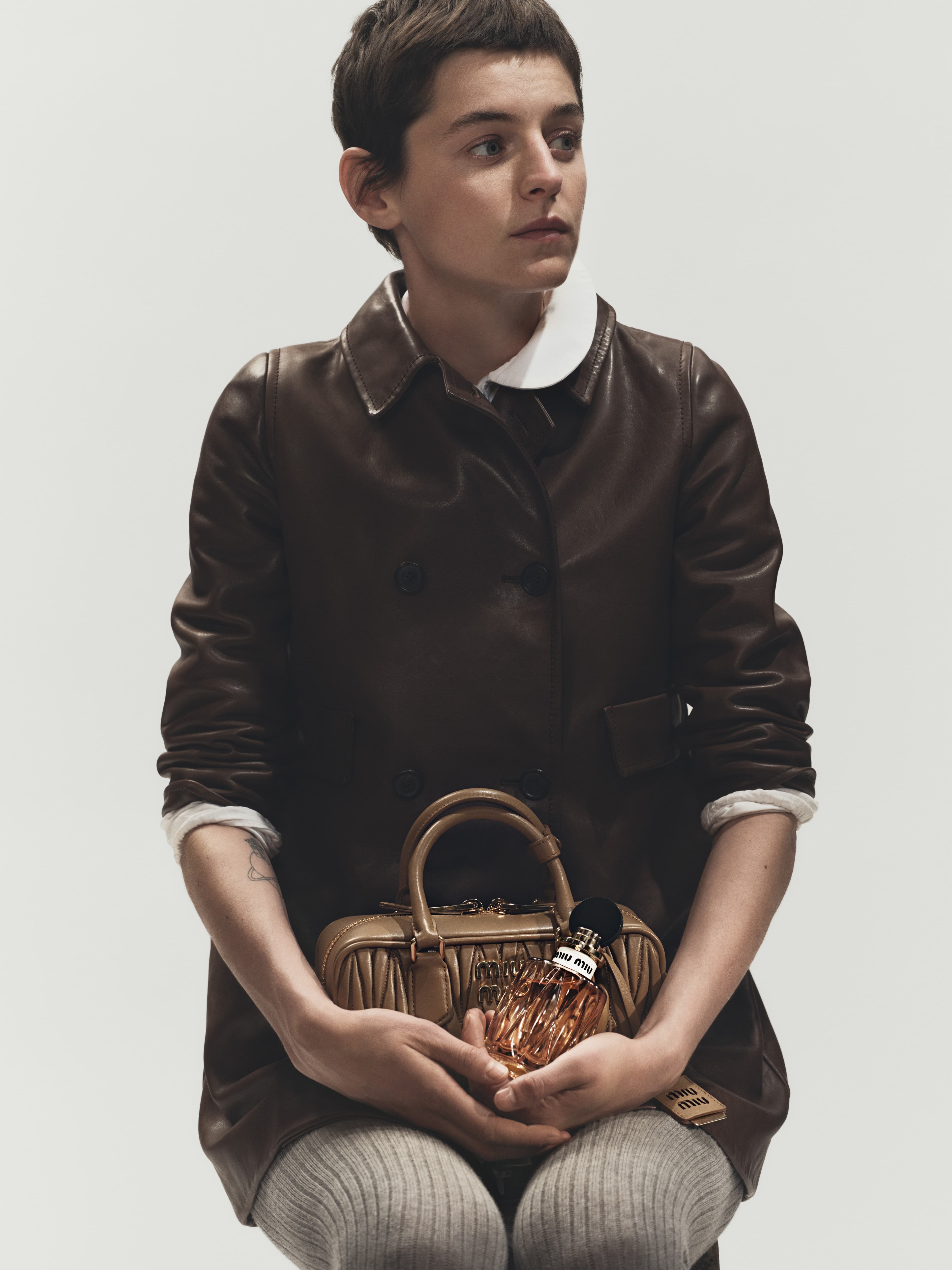 Chaumont ZaerpourIn Corrin’s hand is, of course, the bottle which taps into many of Miu Miu’s signature elements: the black and white label represent the brand’s love of a collar, the matelassé glass bottle pays tribute to the matelassé leather of many of the brand’s iconic bags, and the chestnut bottle is a reminder of a timeless brown that the brand has loved forever. Miutine is intentional. It’s not an addition to the brand’s catalog, but an extension.