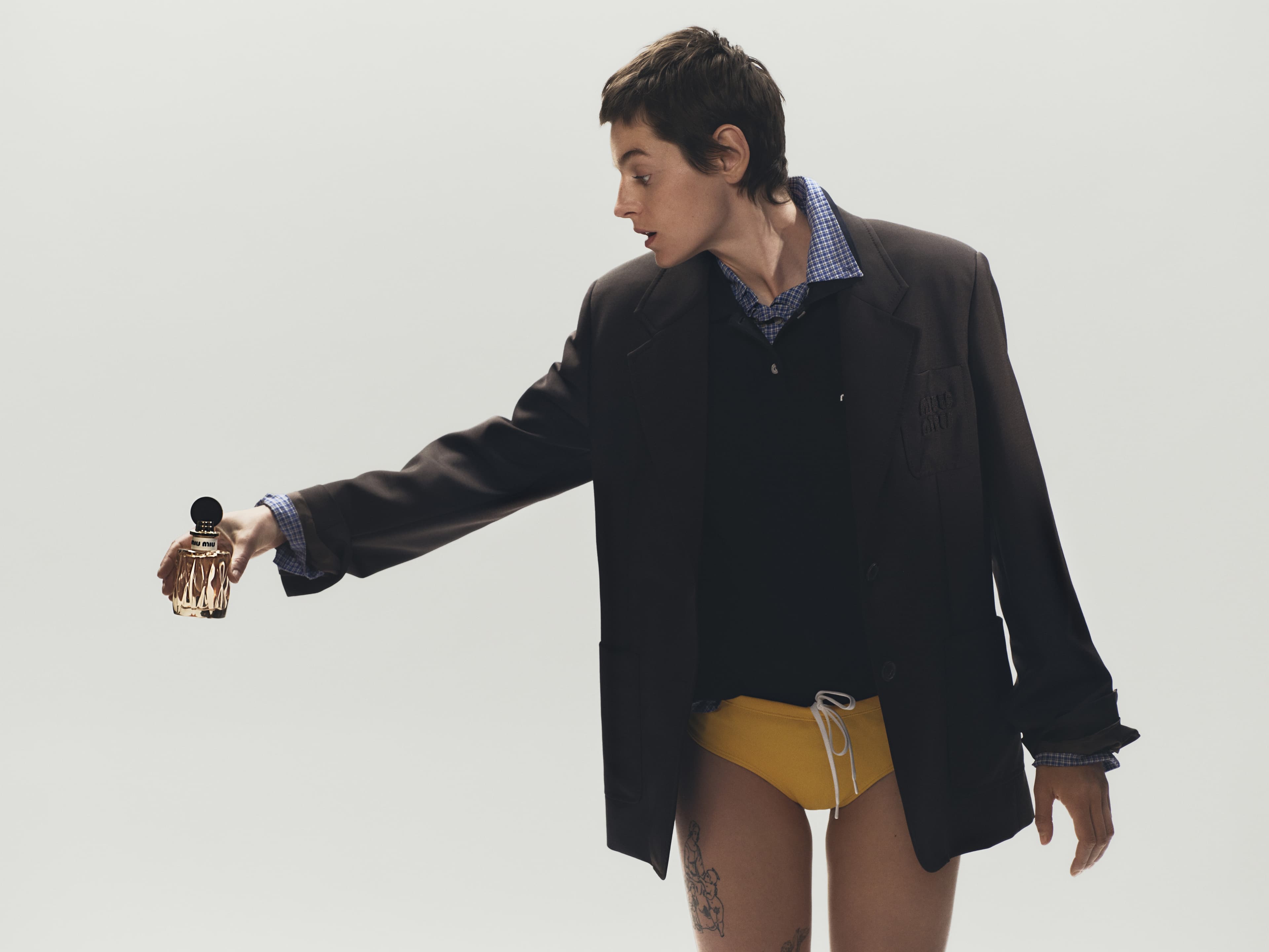 Chaumont ZaerpourIn the campaign, Corrin perfectly embodies the Miu Miu muse: unconventional (they layer a blazer, a knit, and a button down shirt, and pairs them with yellow swimsuit bottoms from the brands Spring 2024 collection), feminine (they are also photographed in a micro mini dress with tights, as well as a satin slip dress with heels), and, most importantly, irreverent. “Irreverence is a tricky thing to capture… It is a quality, an attitude that is omnipresent at Miu Miu,” Campaign Director Haily Benton Gates said.