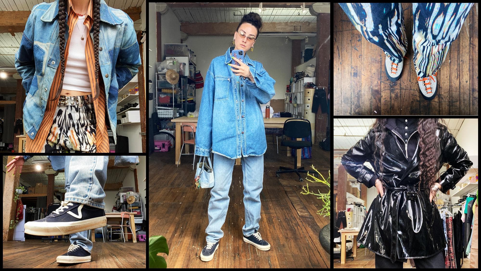 "Day two! Washed my hair and put in my signature braids so they are out of the way while I'm cleaning in the studio. This look is a pretty uniformed Miyako look. I got my Our Legacy pants on with a tank and layered with my favorite vintage orange-striped menswear shirt. This vintage patchwork denim jacket is one of my faves and goes with everything, so thought it would be a good layer for today. My shoes are hiking boots I got while in Japan."
