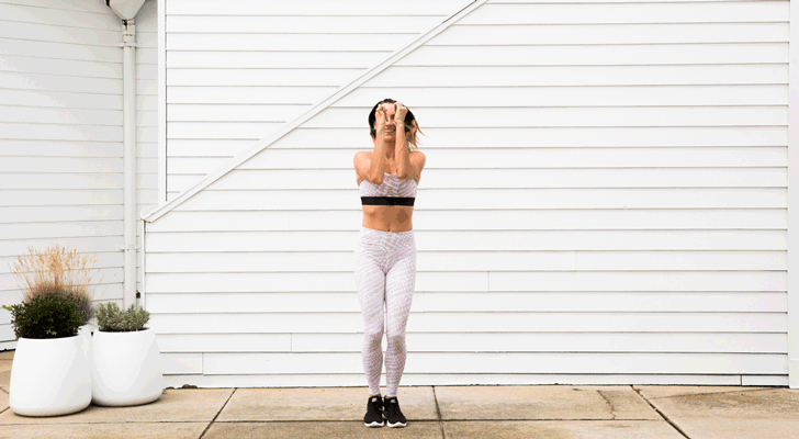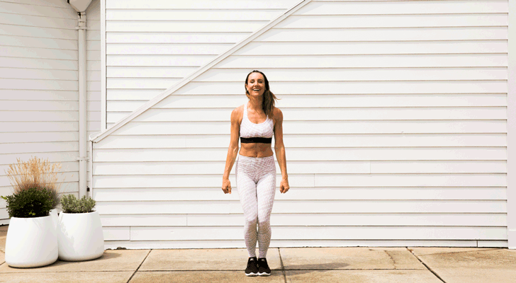 “Standing tall with engaged abs, a tucked pelvis and both feet together, bring both arms up and bend them at the elbows in front of your body. They should be positioned at a 90-degree angle and be at shoulder height. Keep your fists tight throughout the entire exercise. Jump out past hip width equally with both feet, and bring your arms wide so they hit parallel to your sides, keeping the elbows bent. Be careful not to swing your arms, but place them with intention, so you can see them in your peripheral vision and so you do not arch your spine. Jump back in with both feet and bring your arms back to the starting position, at the 90-degree angle in front of you. Repeat this twice.