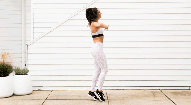“Jump out again, both arms at 90 degrees to the sides, then bring your left knee up to meet the elbow of your right arm, twisting at the waist. Think of cinching the waist as you slightly bend forward to engage your abs, keeping the opposite arm out in the bent position. Extend your leg down to tap the ground while your arm moves back to the side at the 90-degree angle, then bring it right back in front to where the knee meets the elbow. Bring a bounce to your step for seamless transition. Repeat this twice.