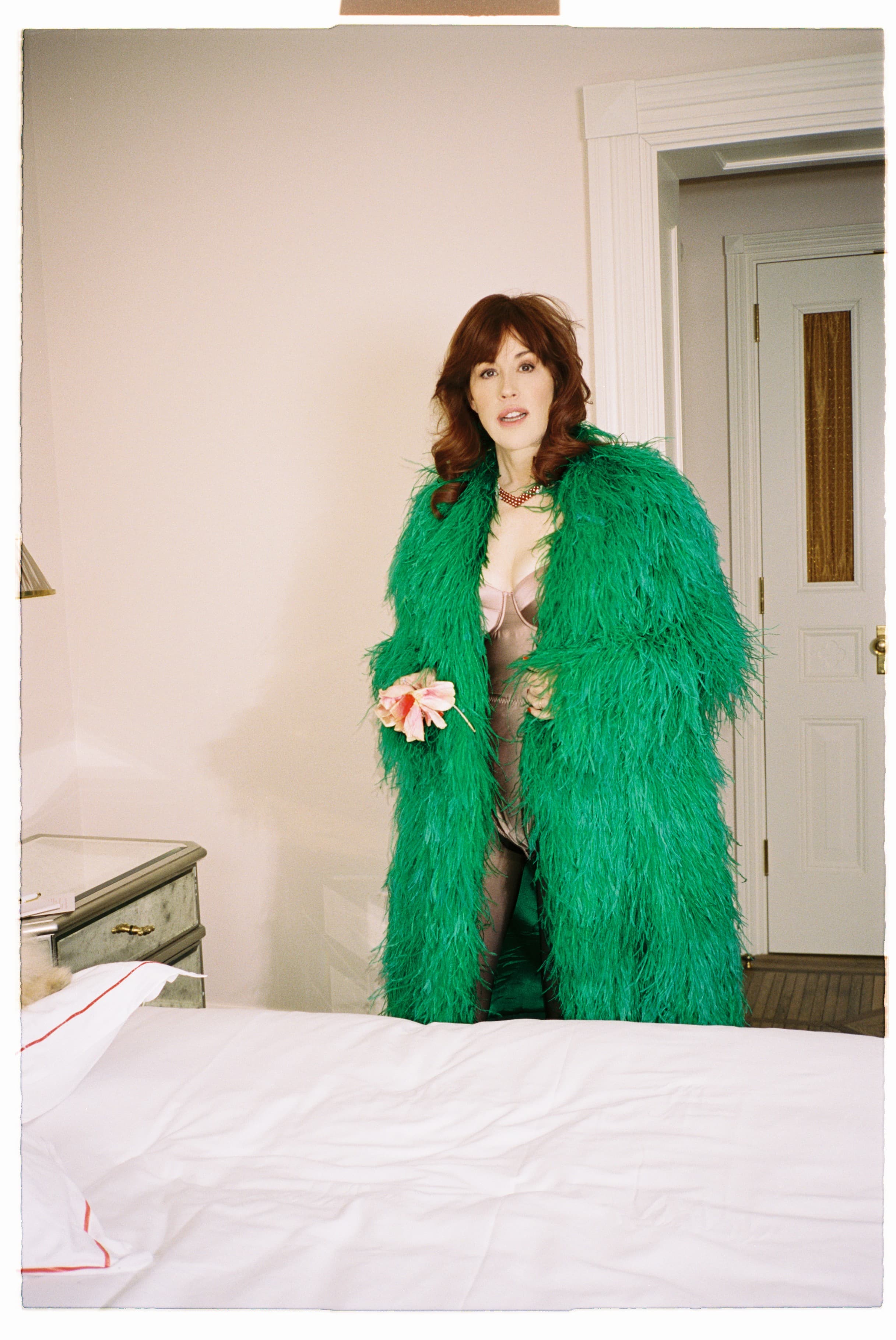 Bodysuit: Fleur du Mal; Coat: Brandon Blackwood Couture Collection; Tights: Calzedonia; Necklace: Van Cleef & ArpelsIn doing so, she wore what she loved rather than what someone picked for her. “Generally, I've been more comfortable with costume designers because it's easier for me to build a character with someone,” she muses. This notion she fuses with event-dressing. “It always feels weird to have anybody decide who I am in my clothes… I almost look at it like I'm playing a character for a night.” On her days off, she’s most comfortable in a pair of vintage red linen pants and a striped sweater. It calls to attention an insult (one that didn’t age well) hurled at her character Walsh in Pretty in Pink: “Where'd you get your clothes, five-and-dime store?” Though a “yes” only recently became the popular answer, Ringwald would never have had an issue with that idea (even if her clothes cost a bit more than a dollar today).