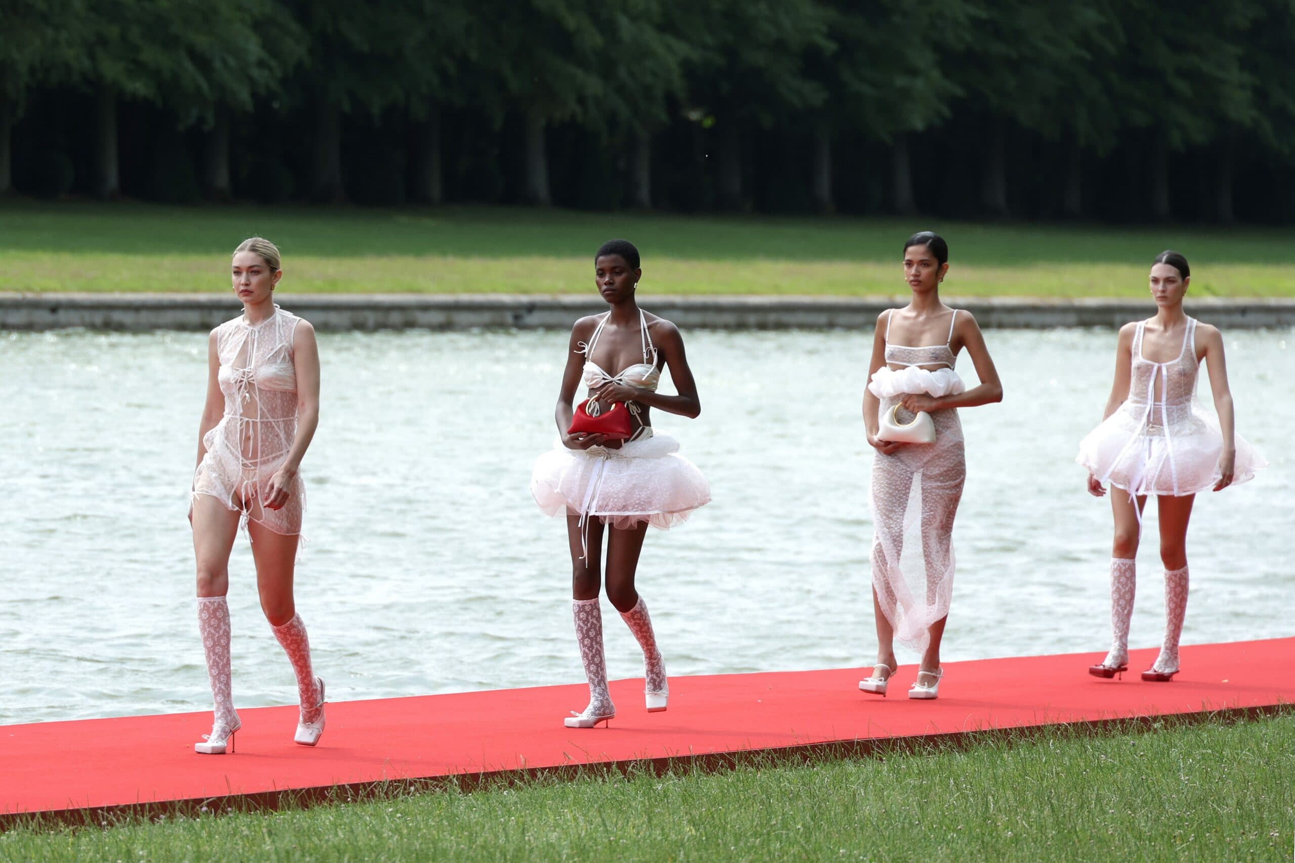 Versailles has had a connection to fashion since the battle of Versailles in 1973. For his Fall/Winter 2023 collection, titled “Le ChouChou,” Simon Porte Jacquemus hosted a show in the gardens of Versailles, right near a pond in which guests—including Victoria and David Beckham and Emily Ratajkowski—floated in boats to witness the collection, which took inspiration from the crinolines and pannier silhouettes from the Rococo era.