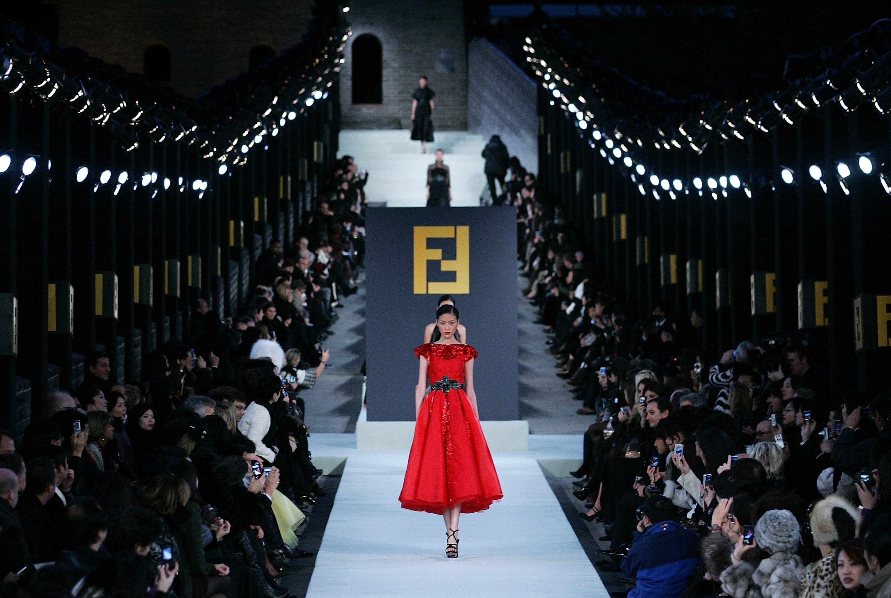 For Karl Lagerfeld and Silvia Venturini Fendi’s Fendi Spring/Summer 2008 collection, the brand took a trip to China to stage a runway show on one of the seven wonders of the world, the Great Wall of China, where 88 models walked along the wall at sunset. The choice to show the collection in China was not only a dramatic one from a setting perspective, but a strategic move for Fendi as they expanded their presence in the Chinese market.