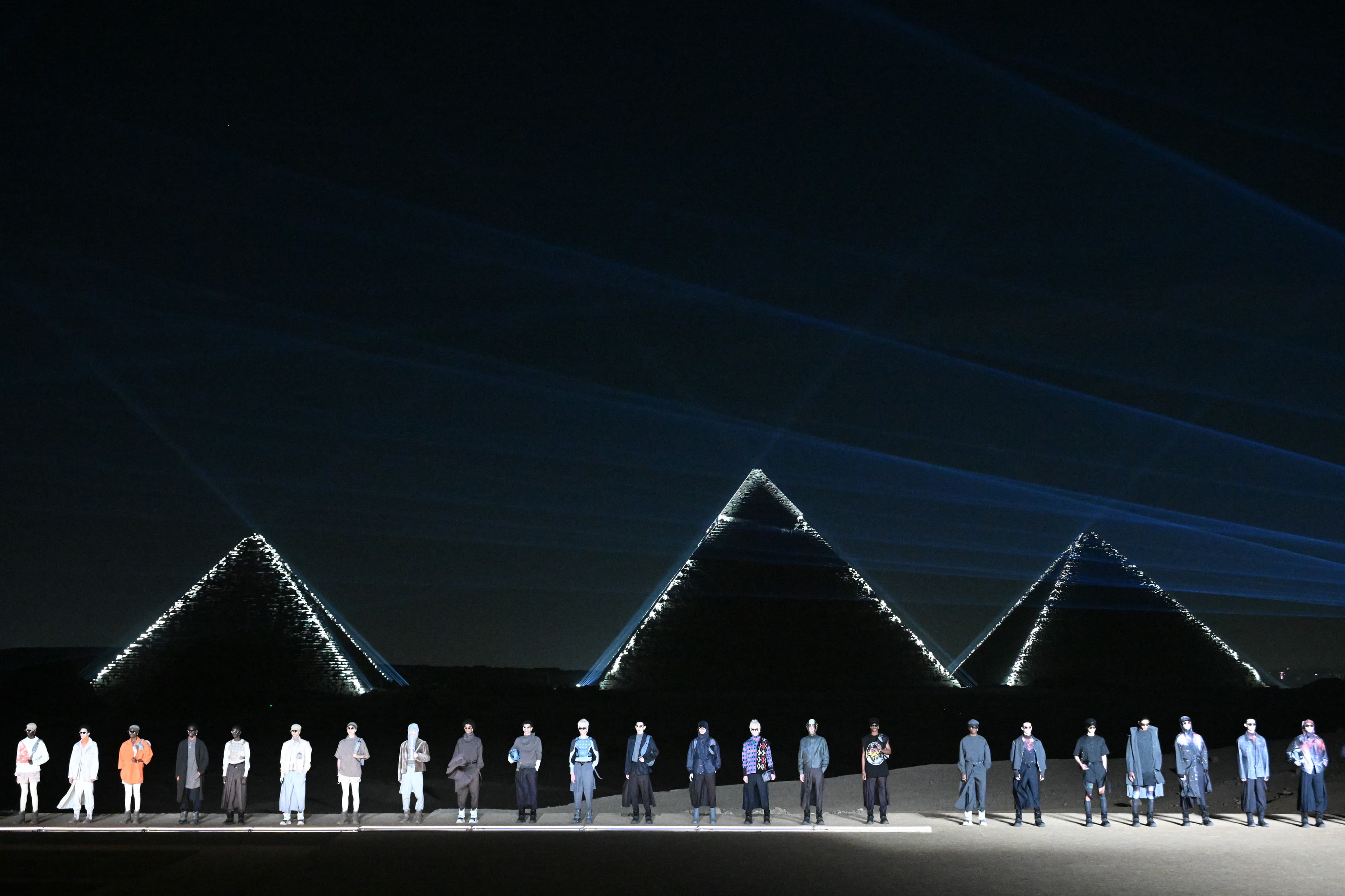 Against the backdrop of the breathtaking and surreal Pyramids of Giza, Kim Jones, the then-creative director of Dior menswear staged his Fall/Winter 2022 show in front of the historic landmarks, which were illuminated behind rows of models dressed in desert-like shades. Robert Pattinson, Naomi Campbell, Lewis Hamilton, Suki Waterhouse—Dior Homme regulars—were all in attendance to witness the monumental show.