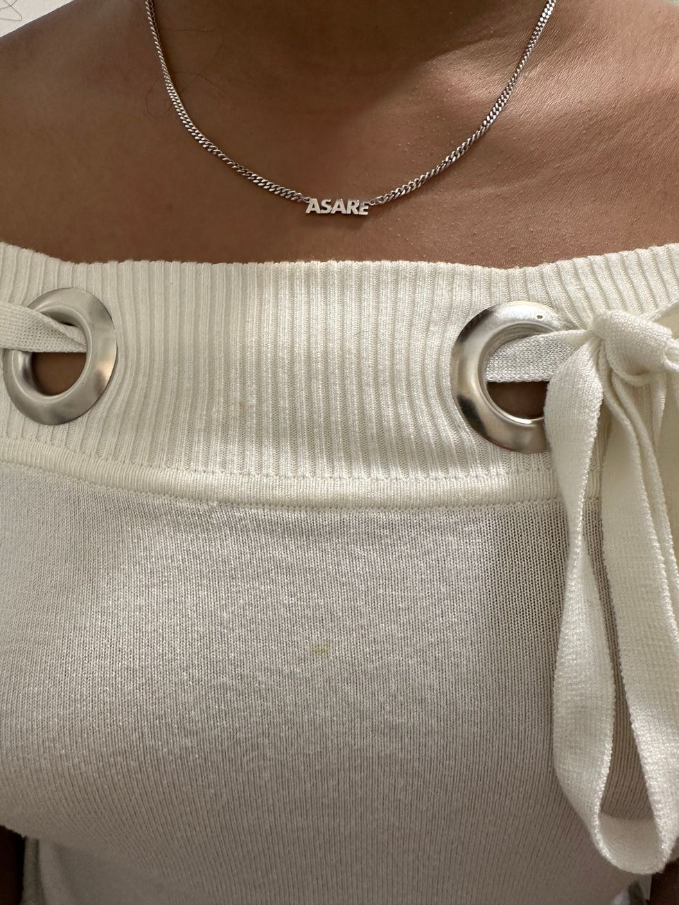 Scholar, curator, and community arts educator Jillian Hernandez wrote this: “The nameplate is a performative object whose stage is skin surface and whose affect is love. A gift to oneself or others, it proclaims: You belong, we recognize you.” And I think, with Asare around my neck, I am continuously proclaiming that to myself. It’s an affirmation, exposure therapy, assertion, and personal style choice all at the same time.