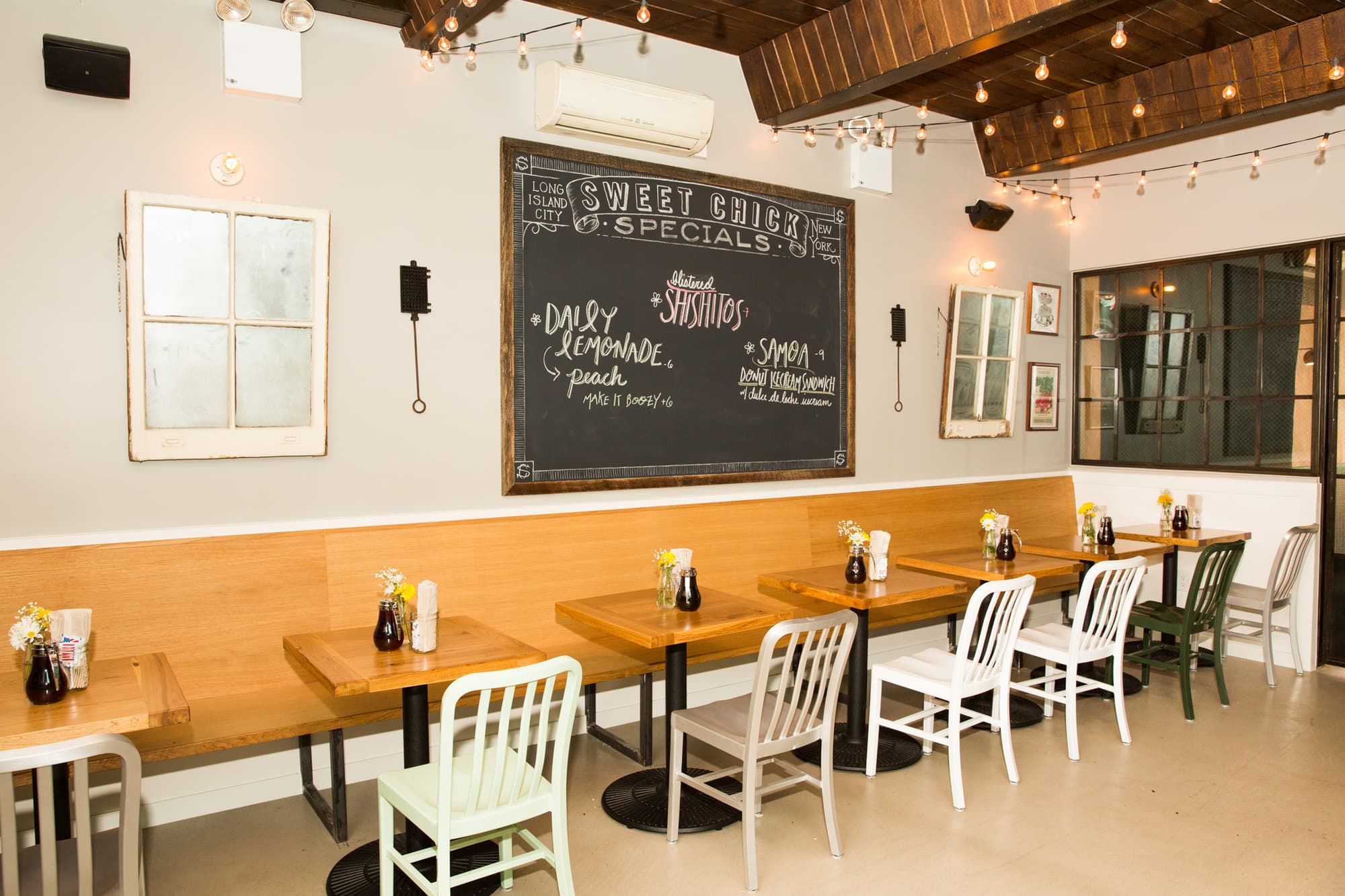 Last night Sweet Chick opened the doors to its newest location in Long Island City on Vernon Boulevard. Plates of their signature chicken and waffles were served by the dozens, diners debated between biscuits or corn bread (some ended up getting both), and drinks were poured at a bar illuminated with a neon sign proclaiming, “The World Is Yours.”