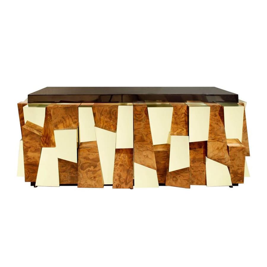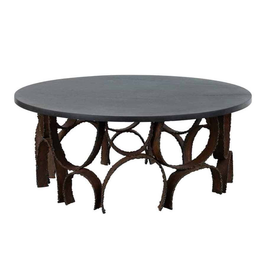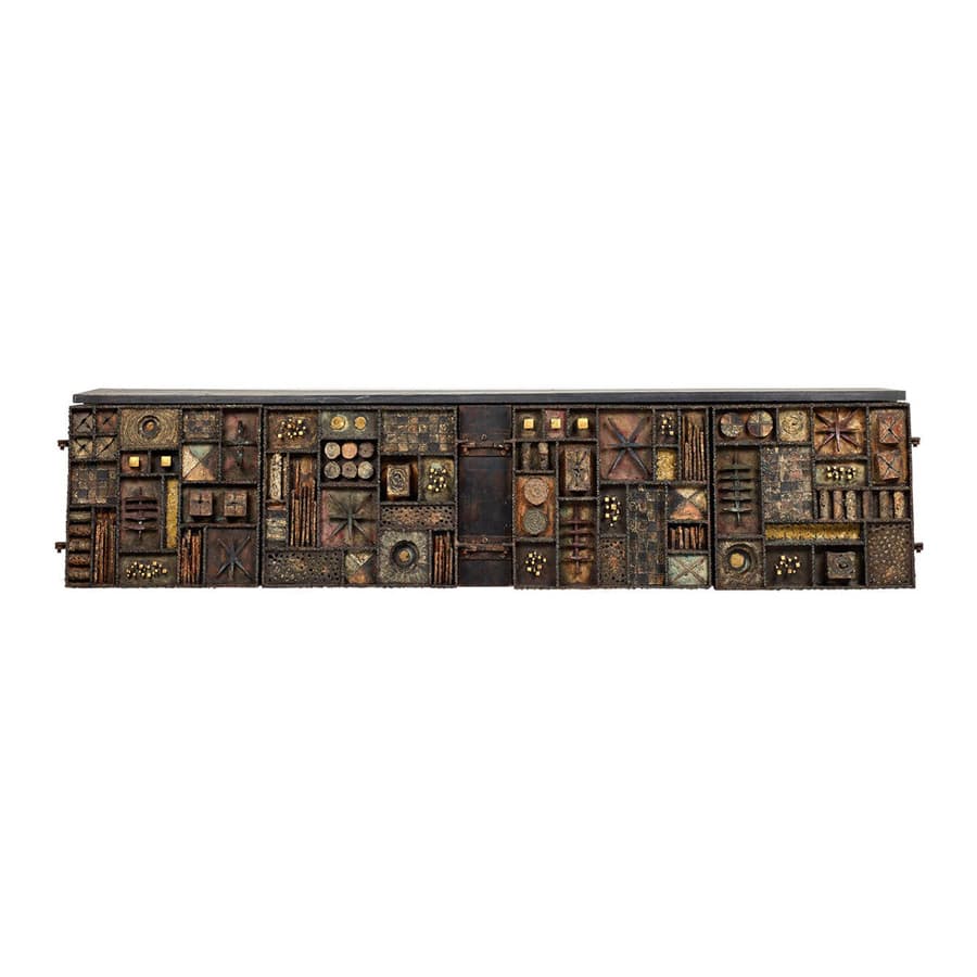 “A leading light of the American Studio Furniture movement, Paul Evans was inspired by seemingly contradictory forces: traditional ‘folk art’ forms, and the latest materials and technologies. Evans primarily worked in metal, not wood (which was favored by such fellow studio designers and Bucks County, Pennsylvania, neighbors as George Nakashima), and his best-known works are cabinets faced in high-relief, patinated steel mounts with metal glyphs, which read like brawny patchwork quilts.”