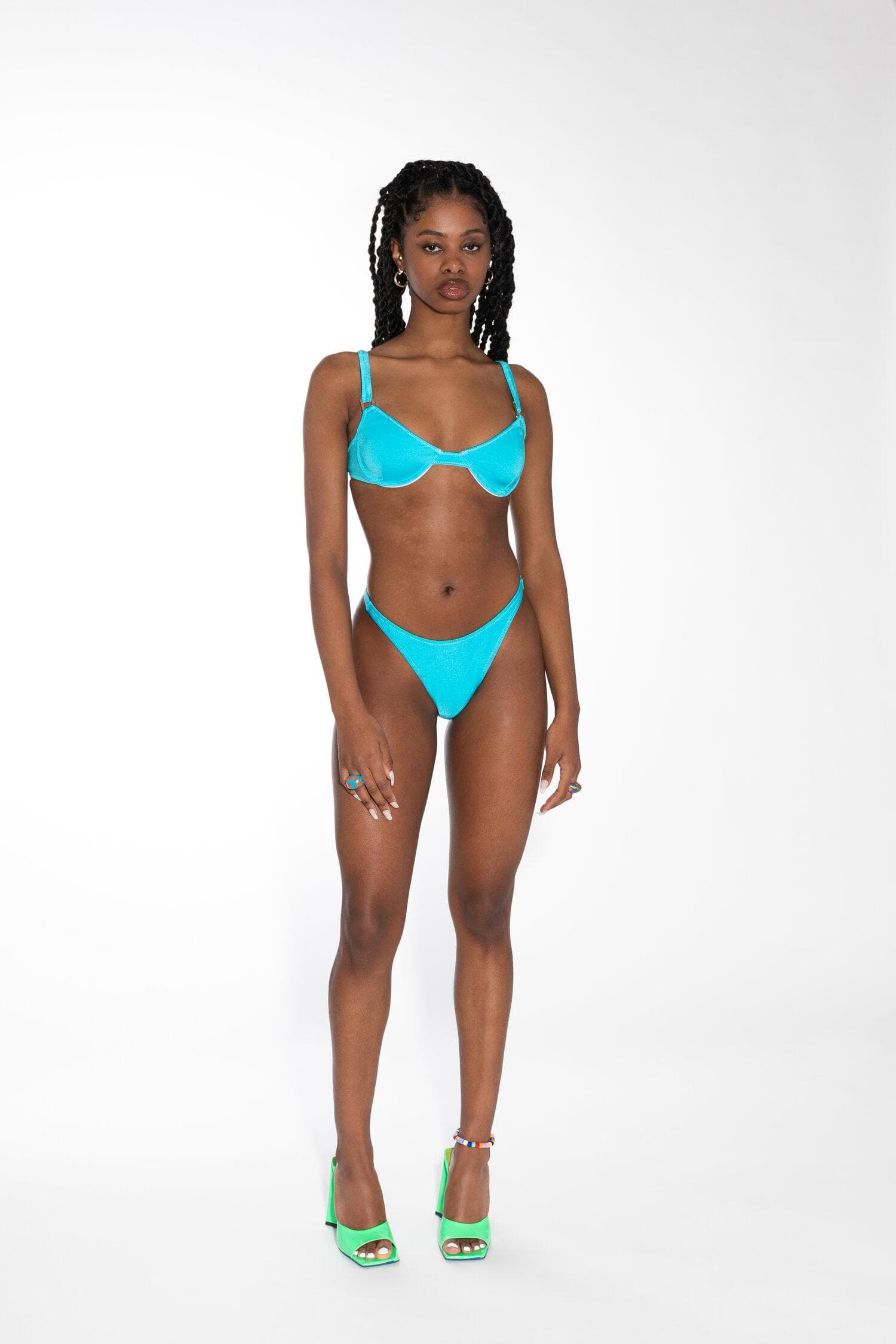 "Our favorite piece is the Peyton One Piece—it features an adjustable halter neckline and low scooped back. It is double-layered, so it contours your body and makes you feel amazing. The Calypso colorway is so elegant and reminds us of the deep part of the ocean where the sand starts to dip. You also can't go wrong with our Josie Cheeky bottom," they add. "These bottoms are designed to sit high on the hips and perfectly accentuate your curves, also double-layered and crafted to give you that seamless look."