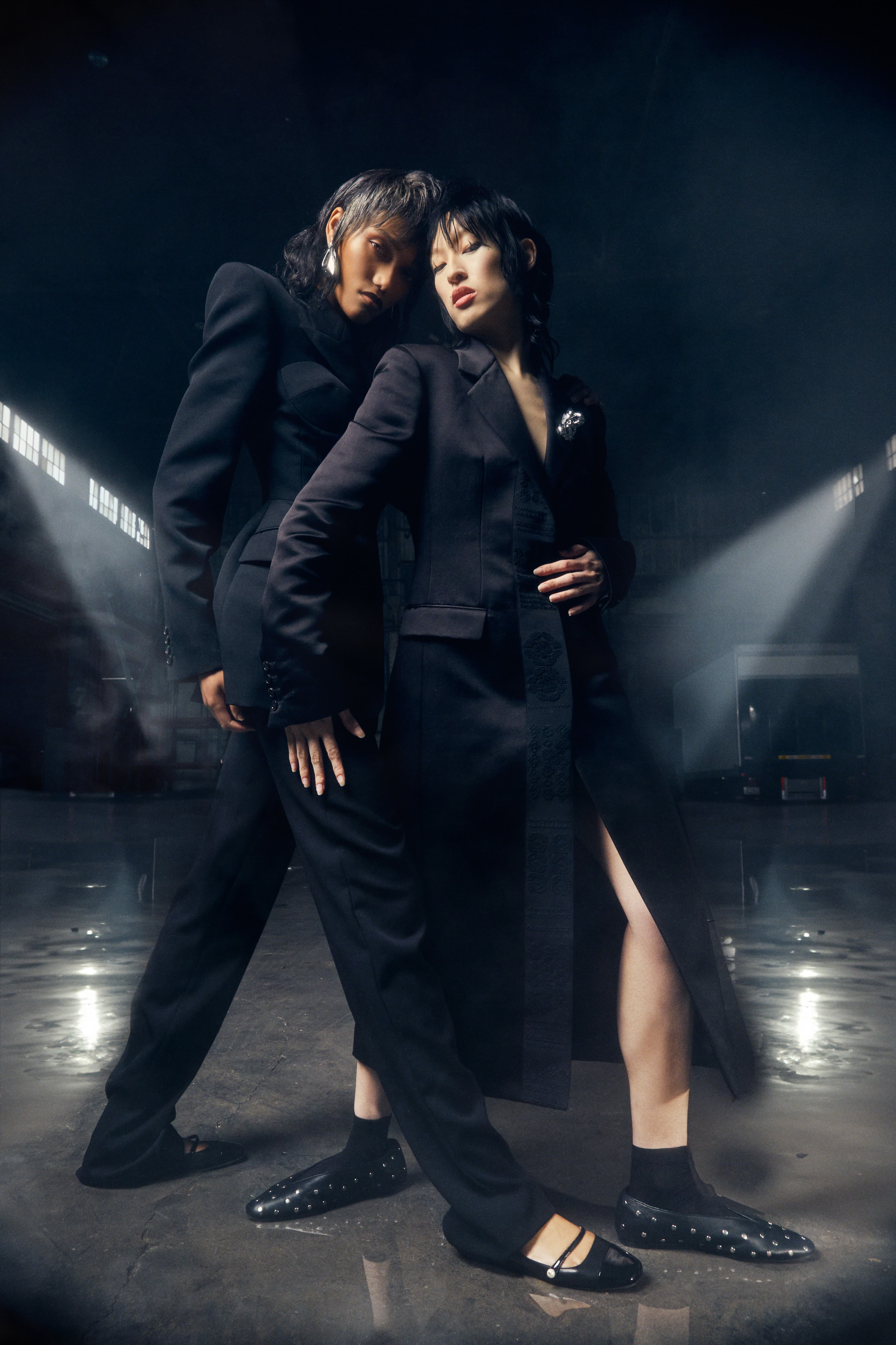 (Left) Suit and Earrings: Alexander McQueen; Flats: Jimmy Choo. (Right) Coat: Veronica De Piante, Flats: Le Monde Beryl; Brooch: Alexis BittarBlack has been steeped in counterculture for decades, be that of the Beat Generation or the punks. It practically vibrates with energy. “There is this subcultural note that connects to music, that connects to poetry, that connects to literature, that connects to intellectualism that's also important,” says McClendon. “There is a way in which, in the mid-twentieth century to the late-twentieth century, black coalesces as being this color of the creative industries.”