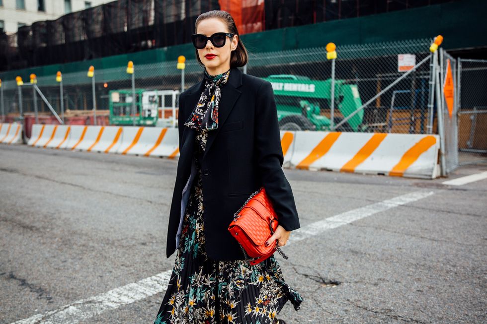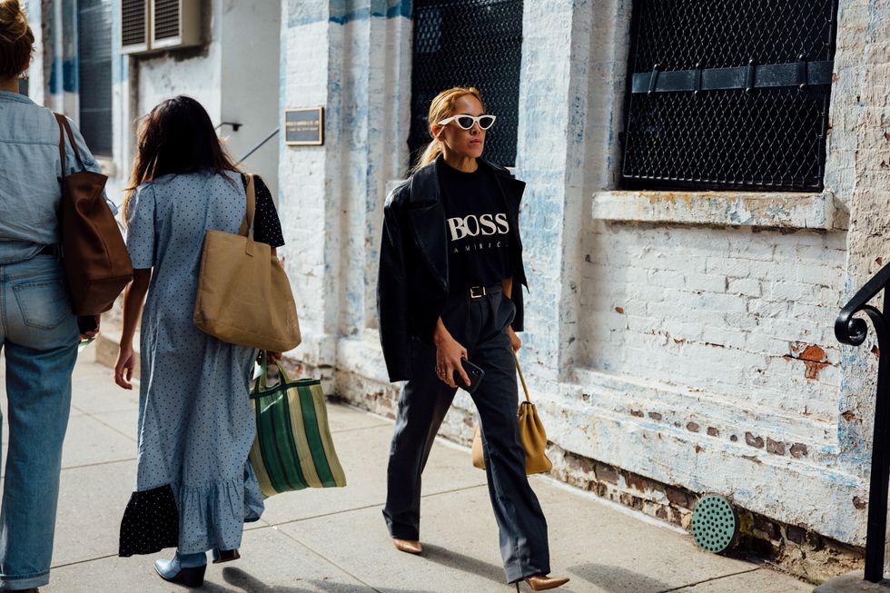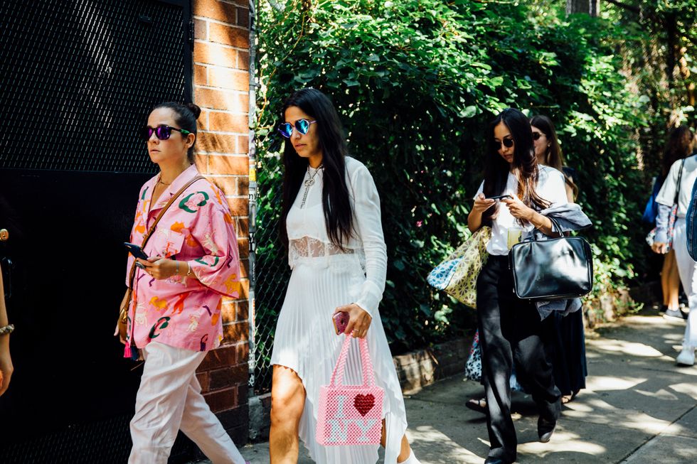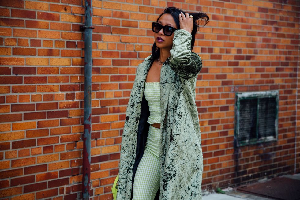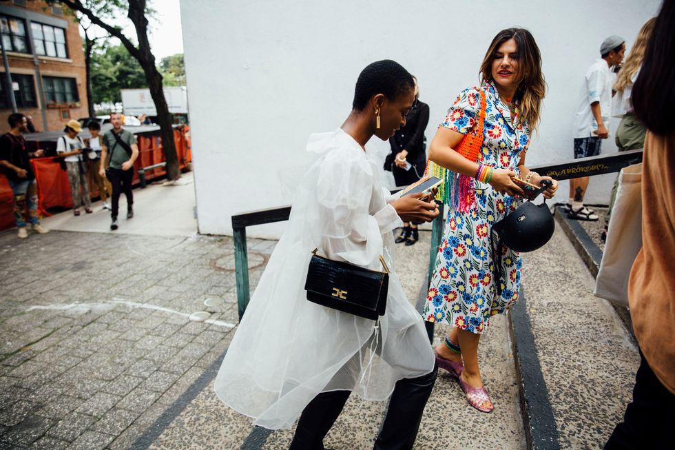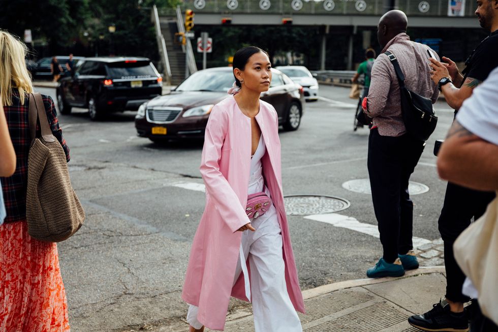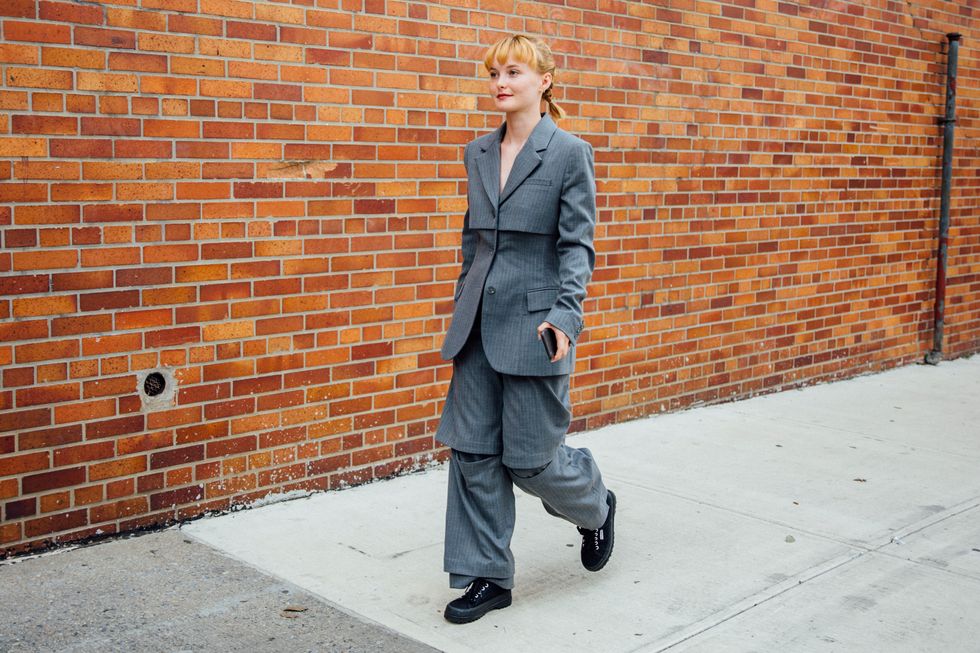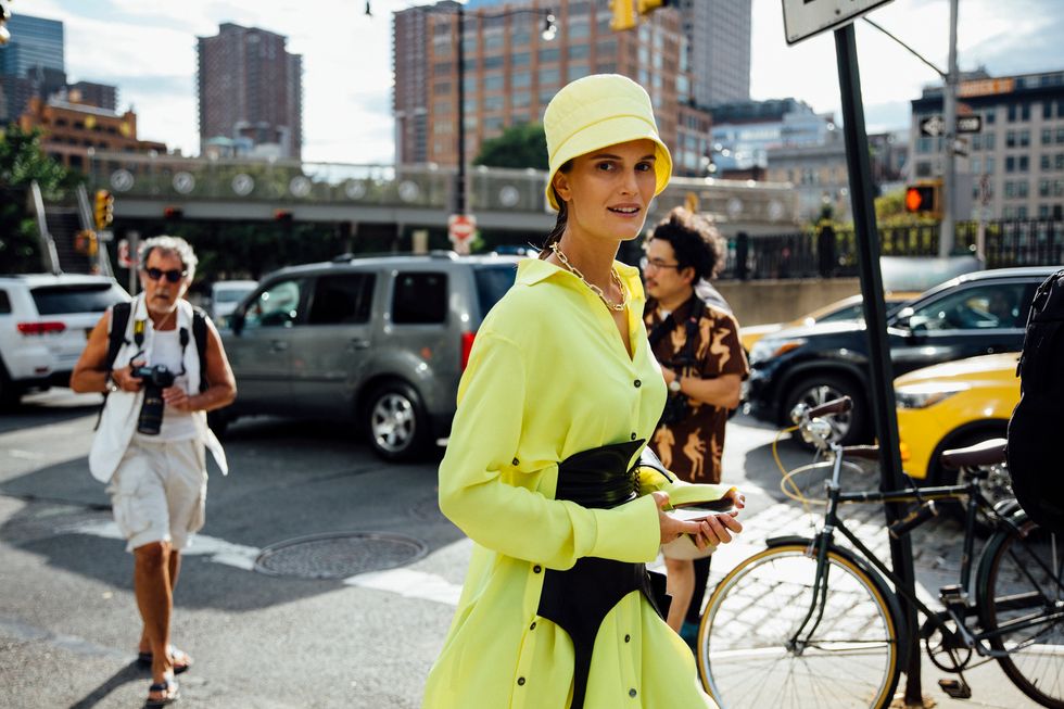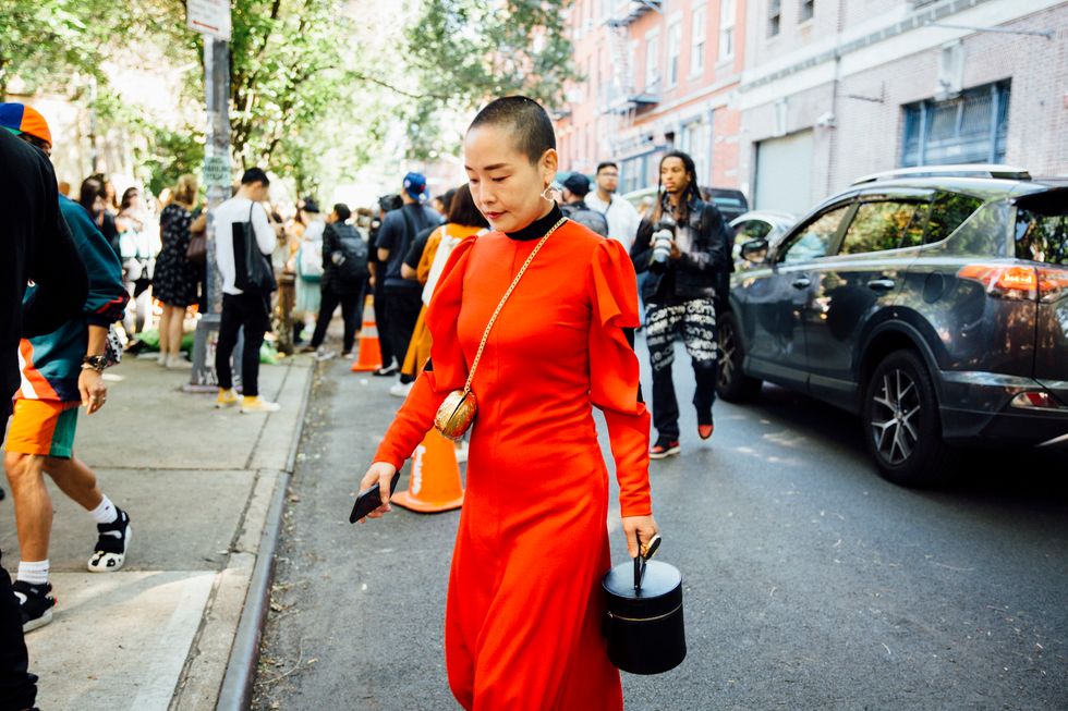 If there’s ever a place to gather inspiration for getting dressed in the morning, it’s outside a New York Fashion Week show. The first spring 2020 collections made their drizzly debut last Friday, and despite the weather, street style was anything but bleak. Show goers championed a new era of 1980s maximalism with sky-high shoulders, slick suiting, and shades of fuchsia and chartreuse. Shoewise, we’re seeing more flatforms, flared-base heels, and itty-bitty pumps (none of which are practical for the precariously cobblestone streets of Soho, but are gorgeous nevertheless). We also noticed more and more people dressing up their hair, adorning styles with statement clips, pins, and Jackie-O-esque scarves. Scroll through for our favorite street style looks from New York Fashion Week.