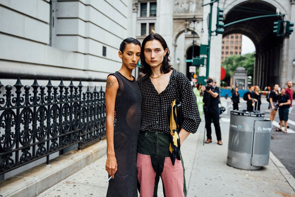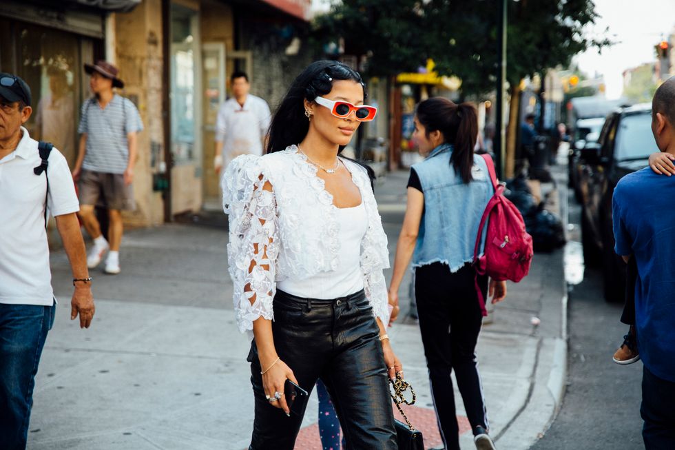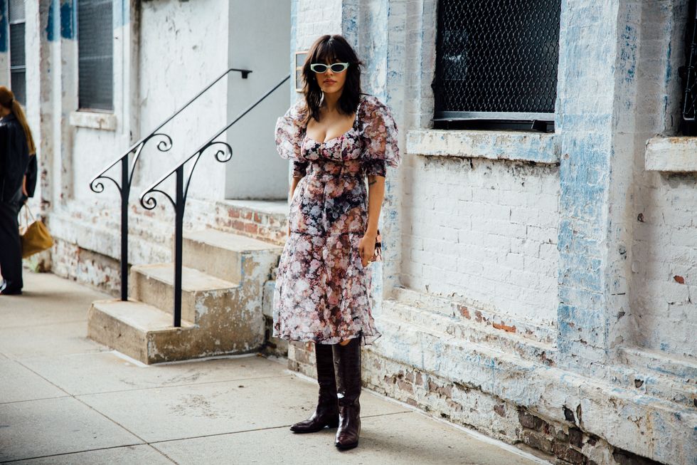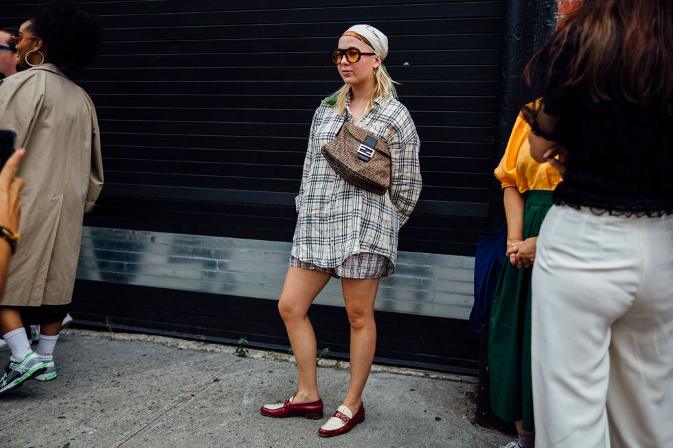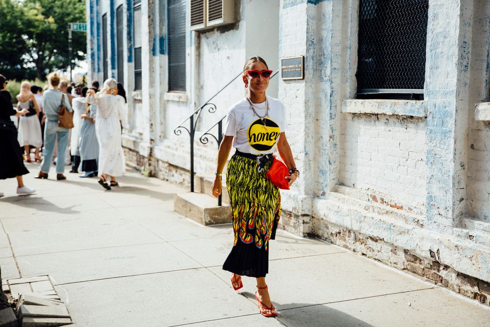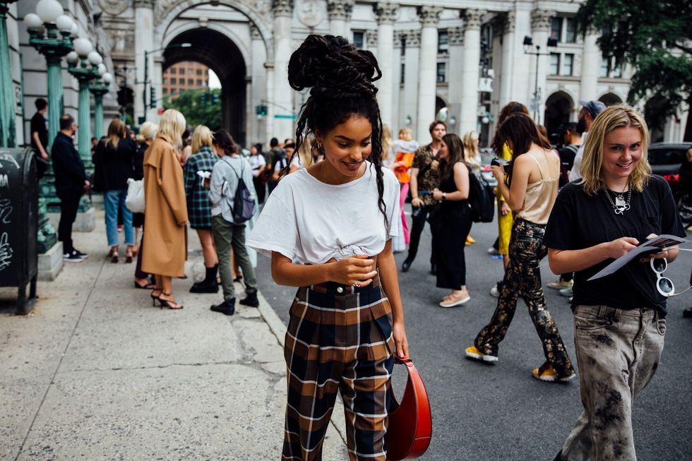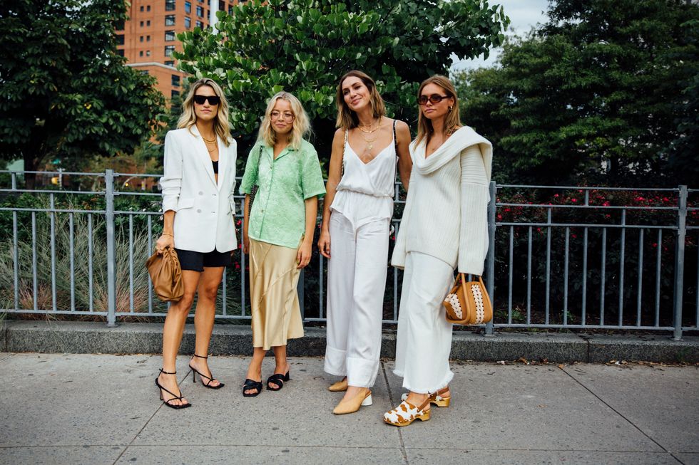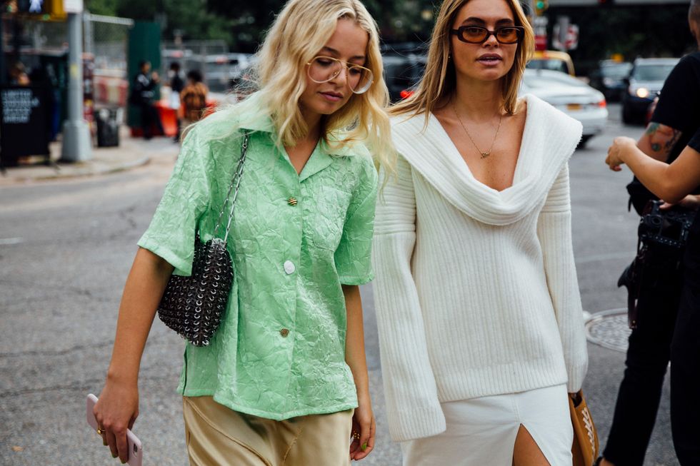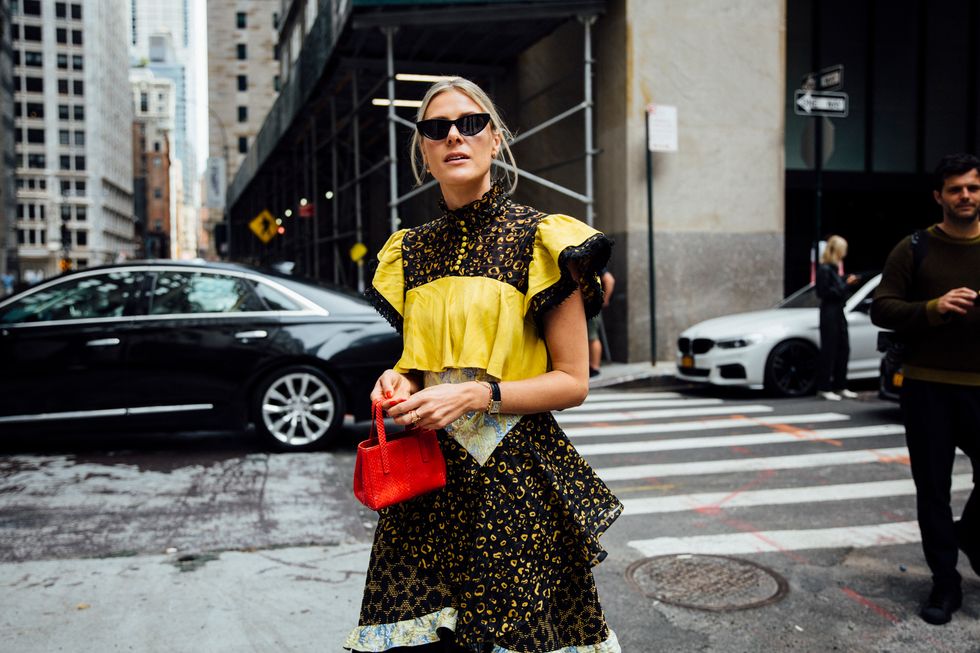 If there’s ever a place to gather inspiration for getting dressed in the morning, it’s outside a New York Fashion Week show. The first spring 2020 collections made their drizzly debut last Friday, and despite the weather, street style was anything but bleak. Show goers championed a new era of 1980s maximalism with sky-high shoulders, slick suiting, and shades of fuchsia and chartreuse. Shoewise, we’re seeing more flatforms, flared-base heels, and itty-bitty pumps (none of which are practical for the precariously cobblestone streets of Soho, but are gorgeous nevertheless). We also noticed more and more people dressing up their hair, adorning styles with statement clips, pins, and Jackie-O-esque scarves. Scroll through for our favorite street style looks from New York Fashion Week.