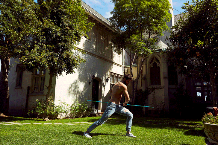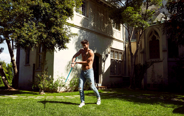 , you’d think his grooming routine was as complicated as a beauty editor’s. But, it’s actually quite the opposite. Take how he cuts his hair on his own or how he uses beard oil which smells like essential oils to create a shiny coif. We had him walk us through his entire low-maintenance routine and show us some bow staff for good measure (wink.) More abs below.