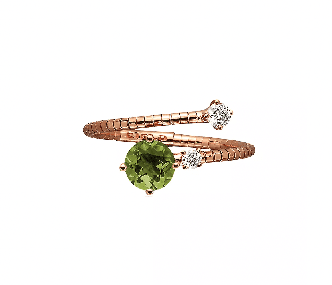 The distinct spiral ring shape deviates from tradition. The sparkling round green tourmaline is a statement-worthy stone symbolizing the pursuit of one's heart's desires and heightened awareness.
