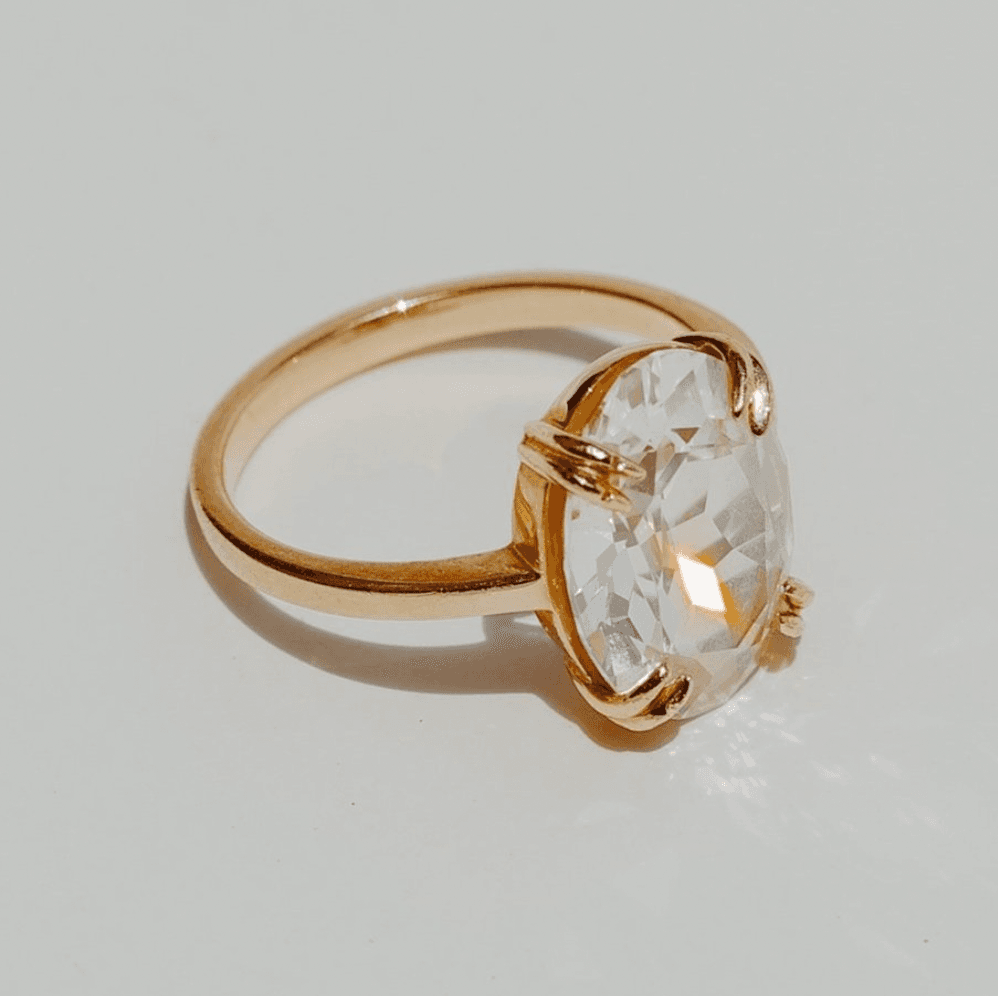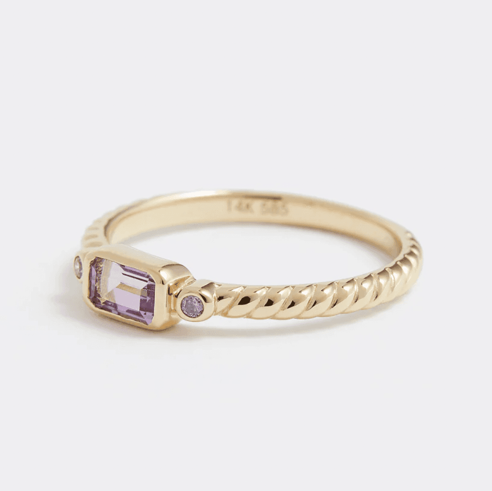 If oversized center stones aren't your preference, consider this exquisite pink amethyst and diamond ring from SORU. It can be worn solo for an elegant look or stacked with other rings for more versatility.