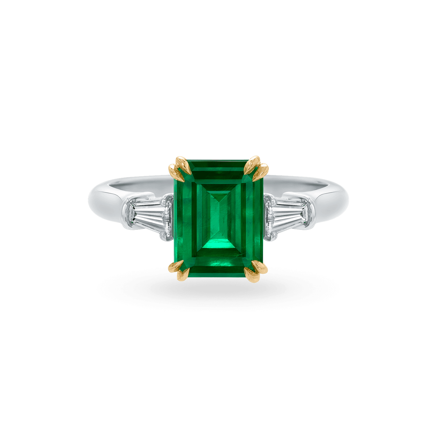 This gorgeous non-traditional engagement ring reinterprets the classic Winston setting with a vibrant emerald-cut emerald and two tapered baguette diamond side stones. This non-diamond ring is a true standout with the emerald's captivating green hue which symbolizes love and renewal.