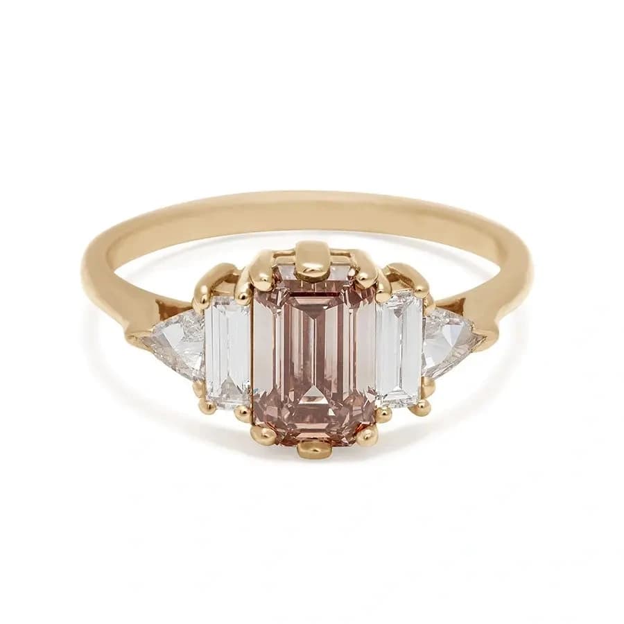 While this specific champagne diamond center engagement ring was made custom for a client, Anna Sheffield can also recreate this ring with your own personal preferences, too. Champagne diamonds are still diamonds but they boast a distinctive and unique rosy color that sets them apart from traditional stones.