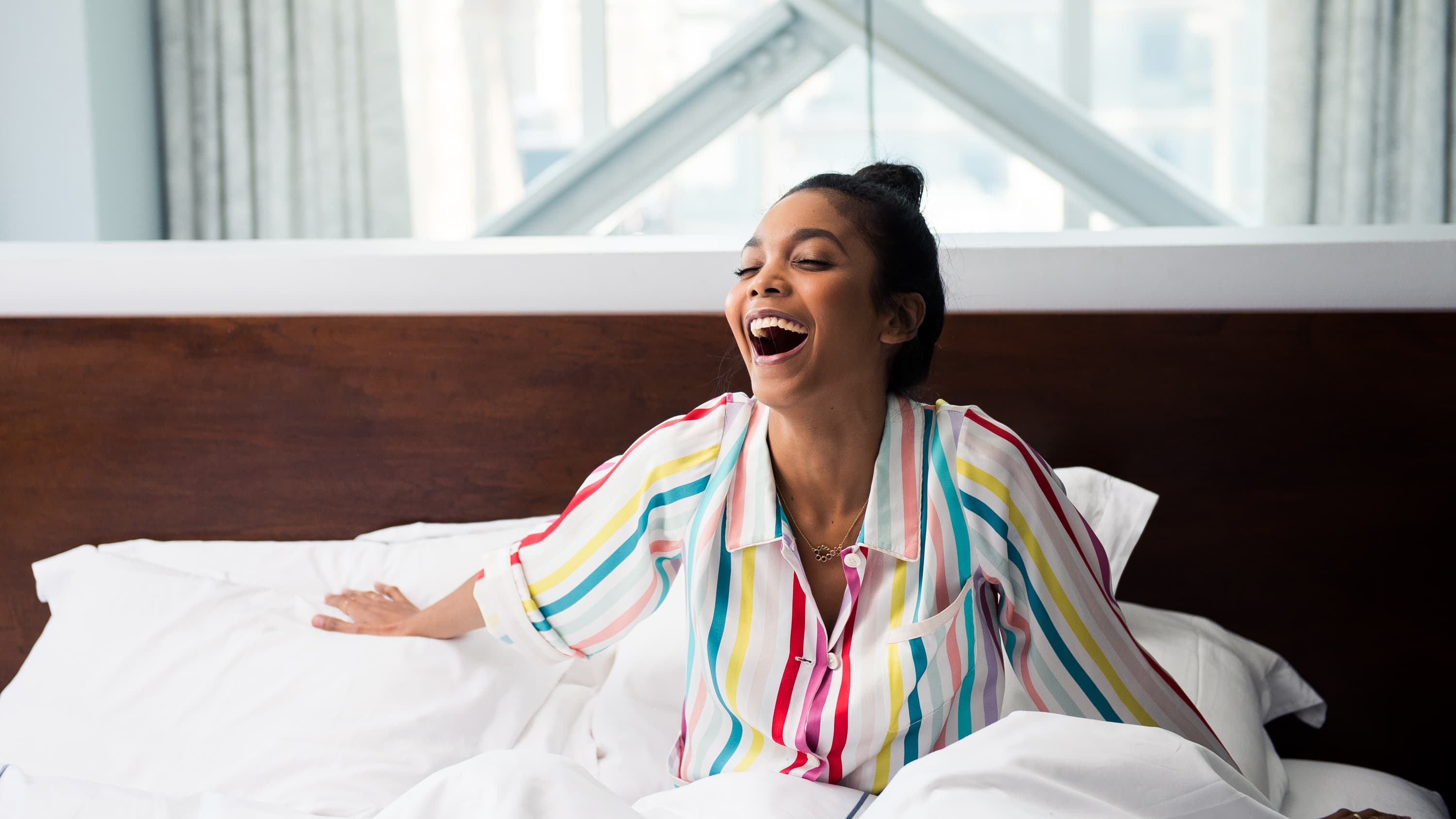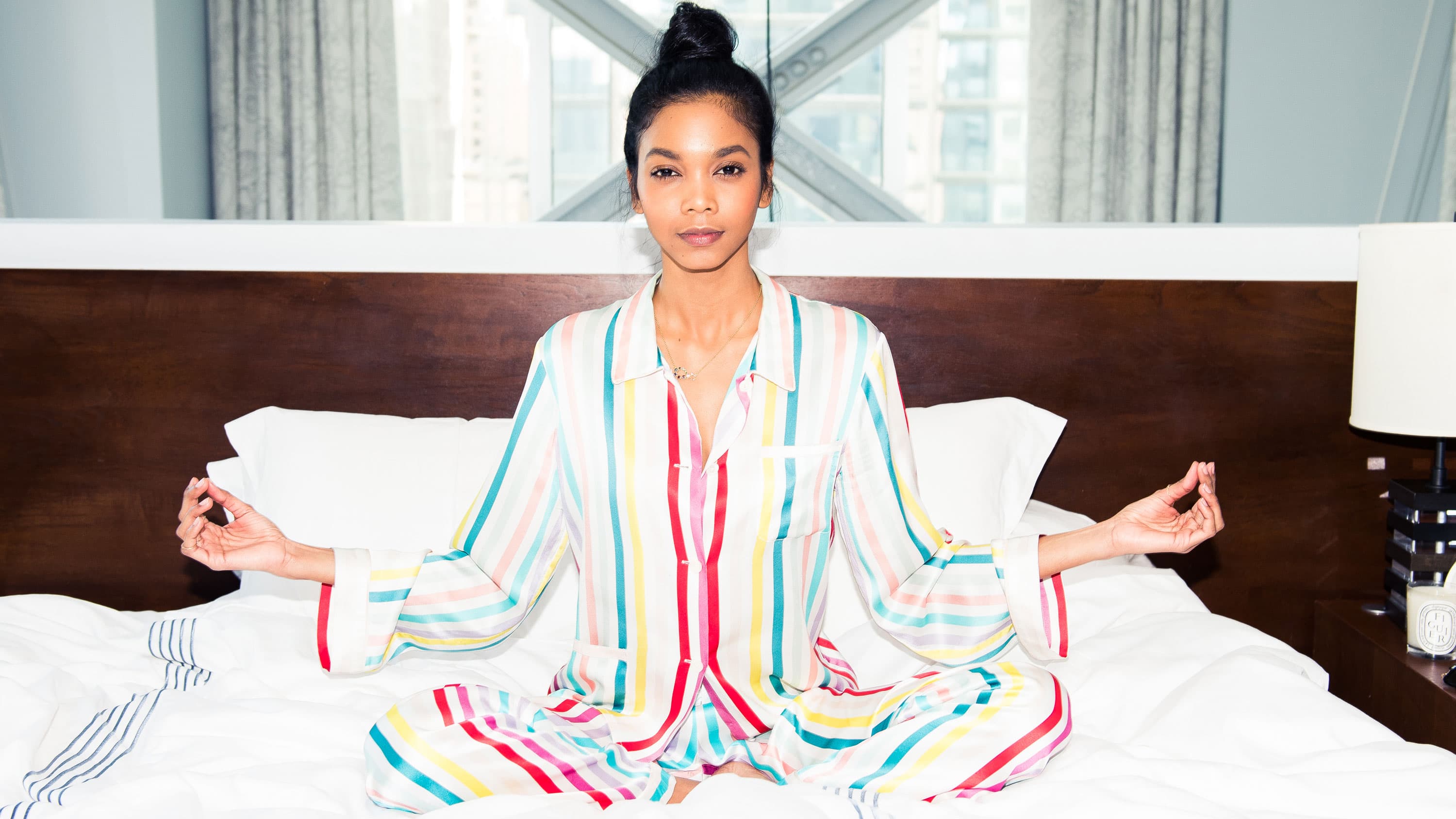 On Jonelle: Pajamas, Morgan Lane; Necklace, Baker & Black Rings, Catbird; Hair, Angela Soto; Makeup, Andriani. Shot on site at 6 Columbus, a Sixty Hotel.