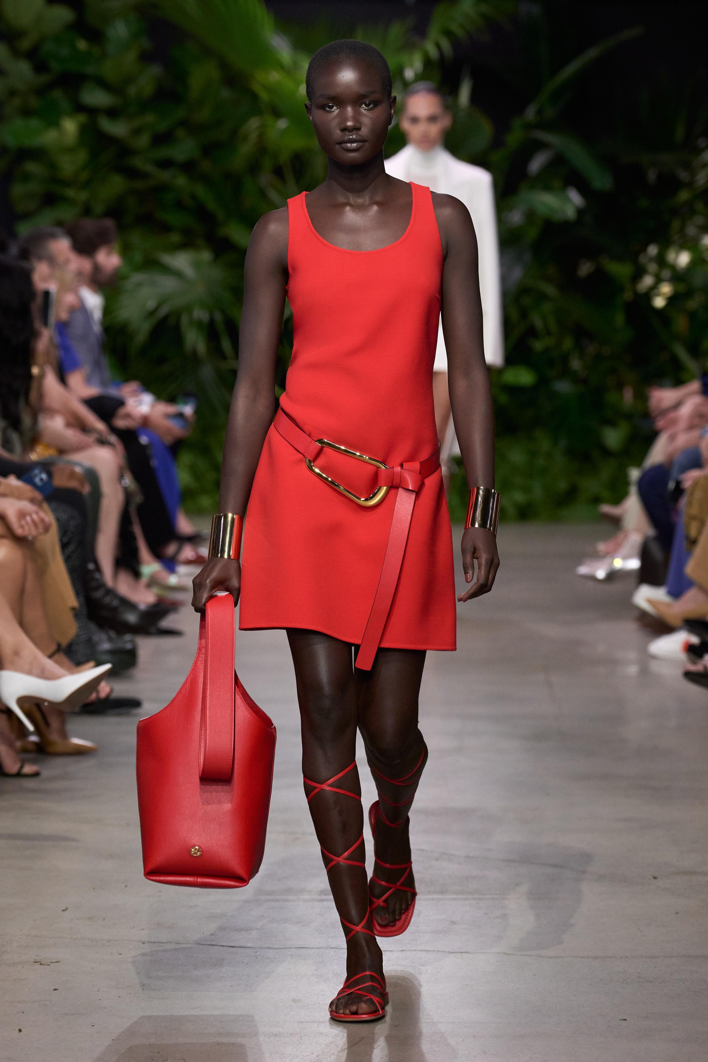 Photo: Courtesy of Michael KorsMichael Kors Collection showed a wide array of looks with this sort of statement belt slung around the models hips. The placement achieves an effect that is '60s mod in nature, contrasted with the modernity of the belt itself.