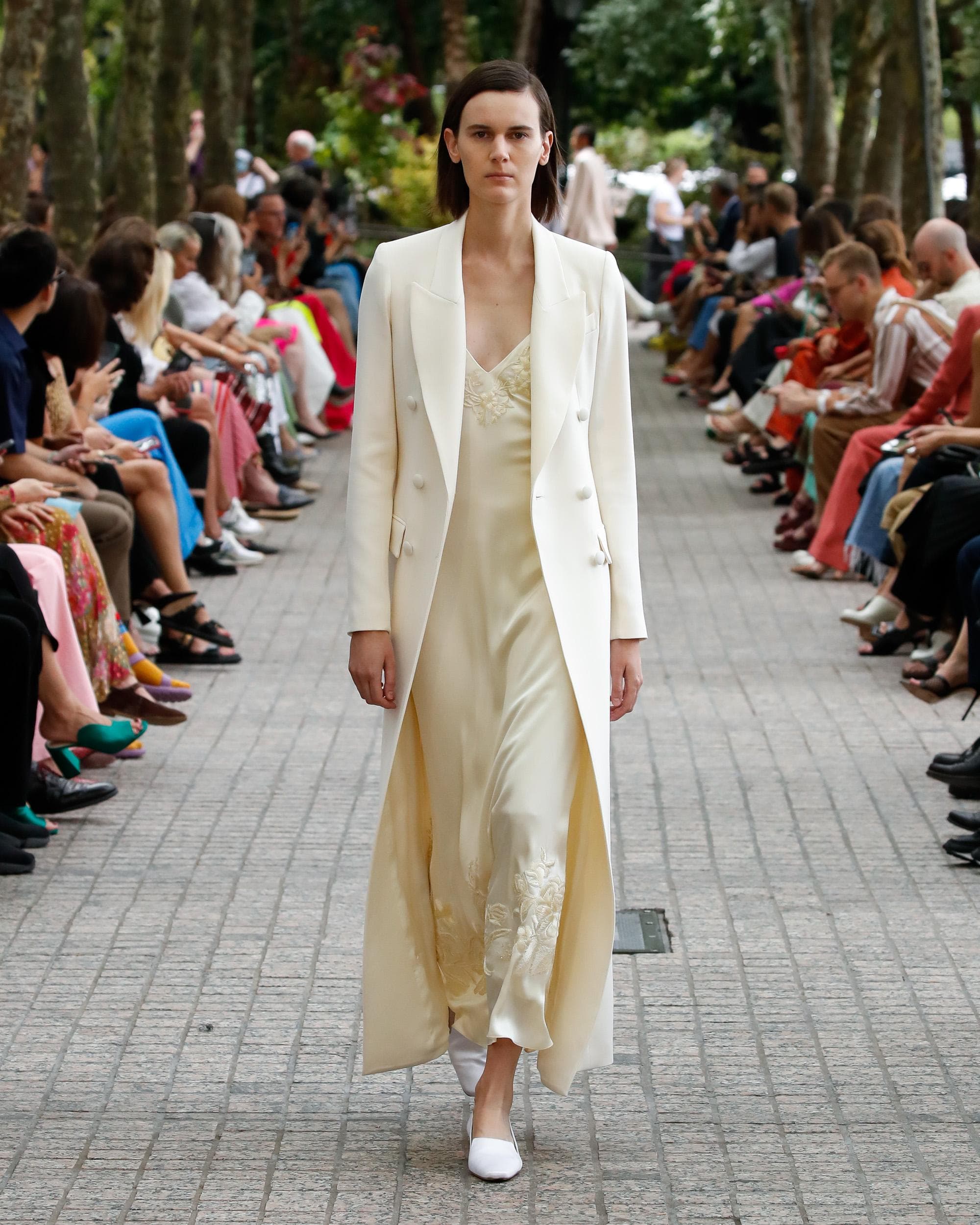 Photo: Dan LeccaAdam Lippes produced a collection all about romance, an idea paramount in a buttercup yellow ensemble. Said hue continues from a dainty ankle-length slip dress to a polished double-breasted duster. The creamy slippers are the perfect finishing touch.