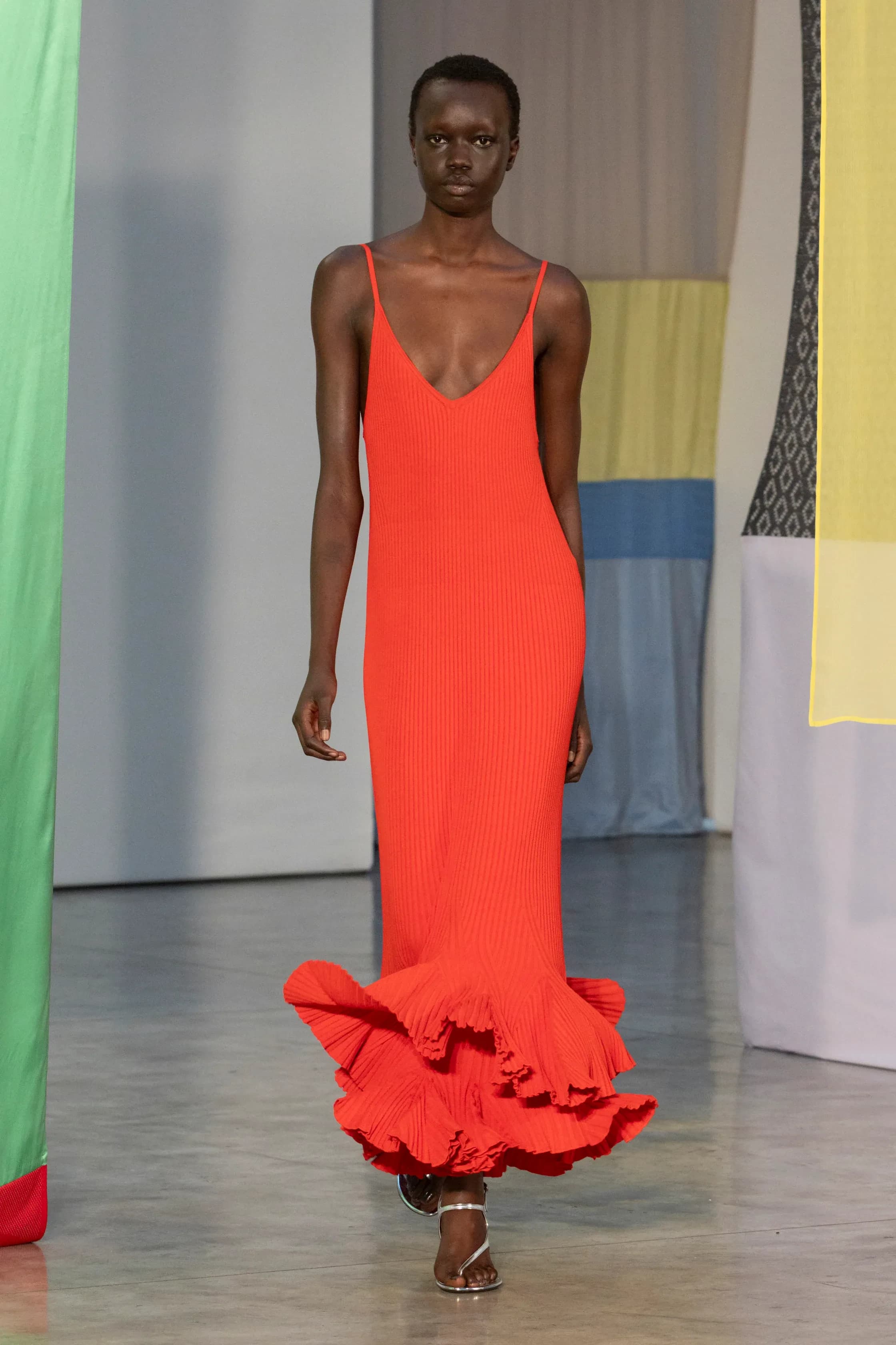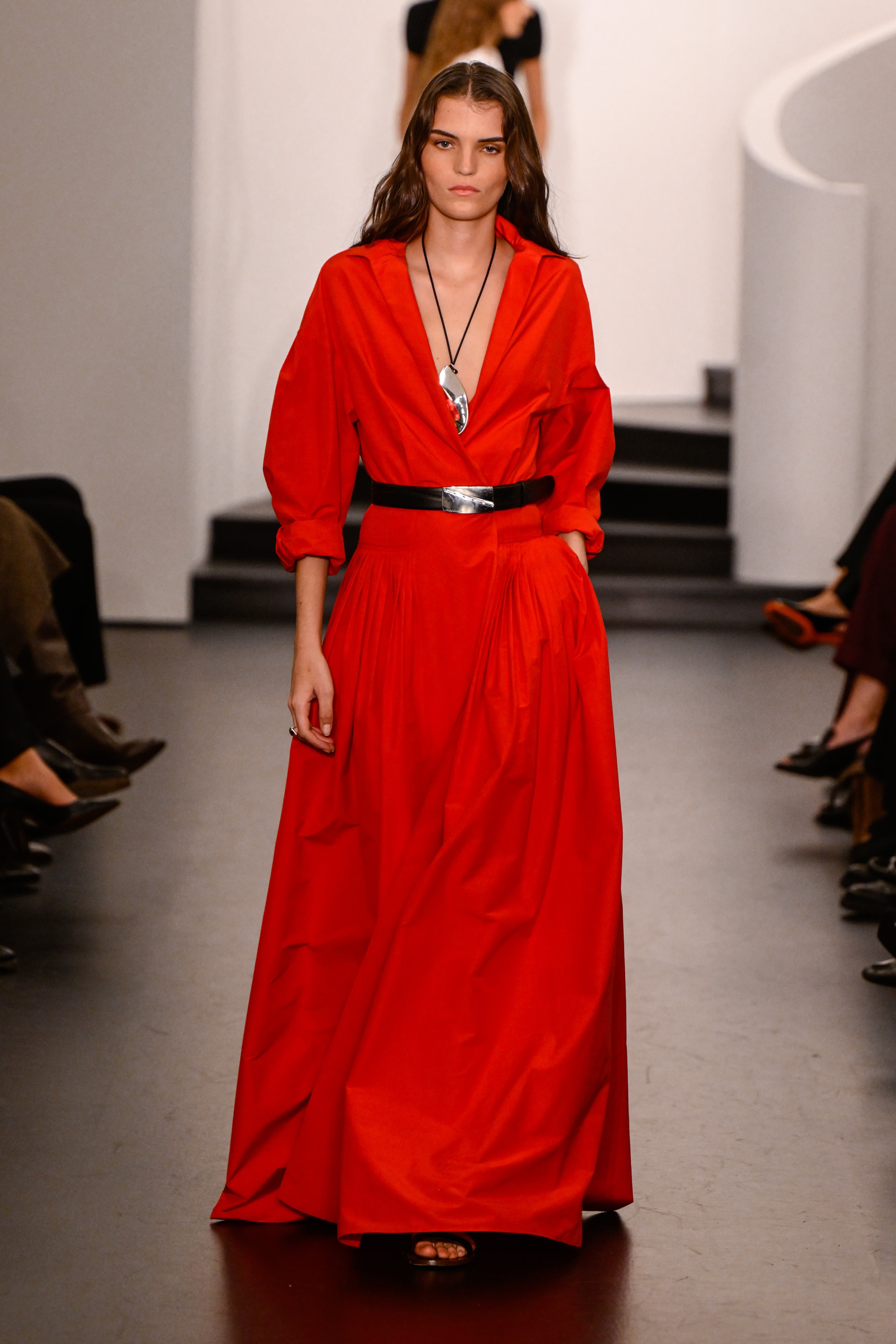 Khaite Spring/Summer 2026 Hanna Tveite / Khaite“Each season, red emerges throughout collections as a punctuation to neutrals. It is, arguably, one of the most enduring colors in fashion, and this season was no different. Rachel Scott’s debut collection preview for Proenza Schouler featured warm, tangerine-red dresses, shoes, and turtleneck jumpers, while at Ralph Lauren, poppy red underscored an entirely monochromatic collection, appearing every five-or-so looks as dresses, suiting, neckties, and trench coats. At Calvin Klein Collection we saw deep red pants and tiny red clutches, while at Khaite there was a very Khaite-coded blood-red leather blazer with a flipped collar and faux sleeves.” – Ella O’Keeffe, Senior Fashion Editor
