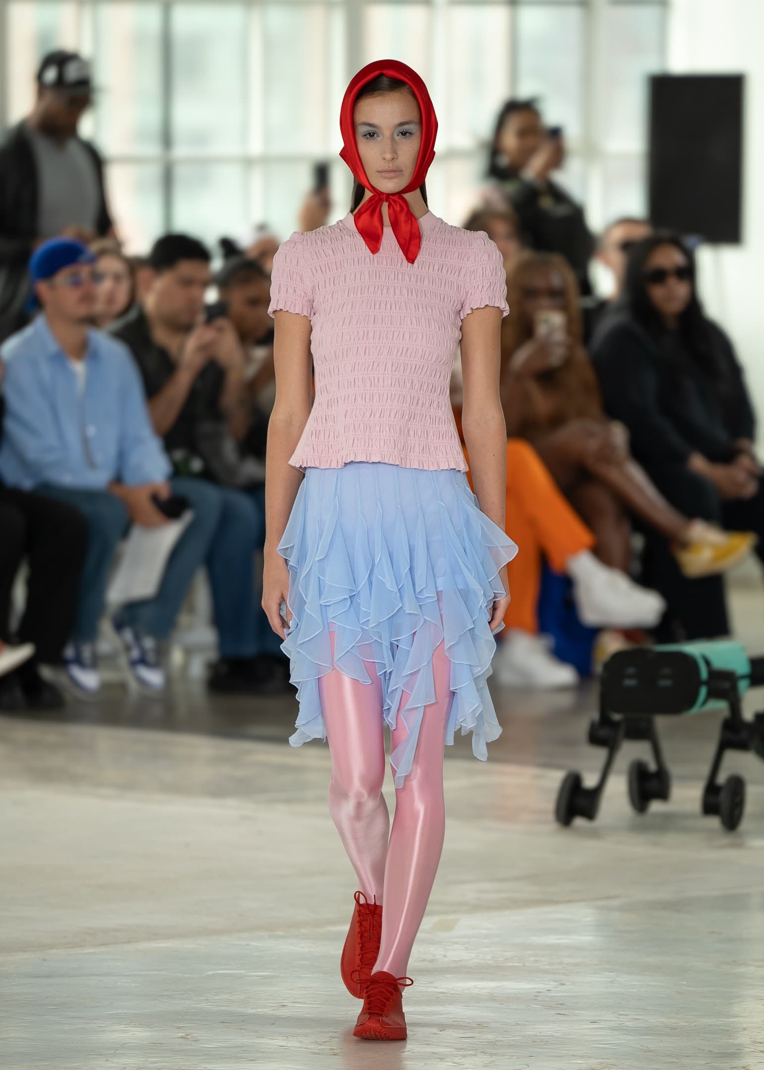 Sandy Liang Spring/Summer 2026 Sandy Liang“Headscarves were prominent on Private Policy’s Can We Be Friends? runway, silk ones tied underneath the chin in bold colors to both clash with and complement the rest of the look. At Sandy Liang, headscarves (tied at the back of the head) were a perfect match to the print of the outfits, in one case completing a four piece set. On Calvin Klein’s runway, headscarves tied otherwise simple and sleek looks together. These three runways serve as examples of how to style the same thing differently. Accessories, especially at a time where maximalism is embraced and encouraged, can clash in a mysteriously perfect way. Accessories can also complete and complement.” - Bianca Asare, Associate Editor