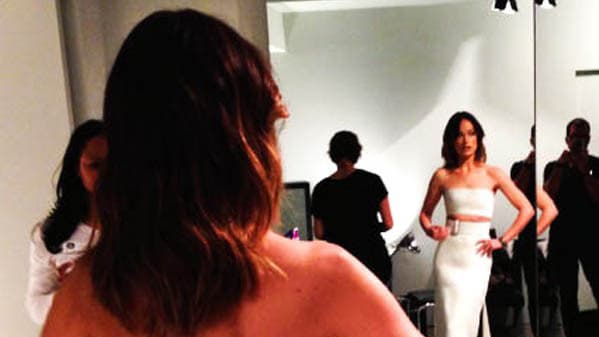 “The dress was custom designed for her by Francisco Costa, the Creative Director of Calvin Klein Women's Collection. It's a completely original design that draws on elements of his Fall 2013 collection, which Olivia attended with a front row view,” stylist duo Karla Welch and Kemal Harris told us. “We received the sketches and fabric swatches to review with Olivia and narrowed it down to this style and decided on color… Or not. Three fittings later… perfection!”