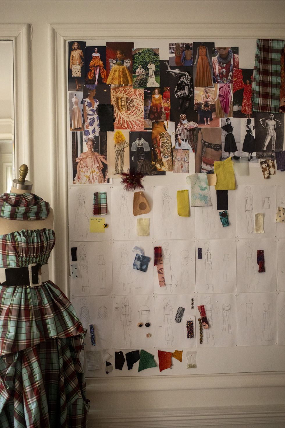 Her eighth collection then combined the influence of the matador’s bolero set with eighteenth-century Spanish ballgowns and Christian Dior’s ’50s full skirts and nipped waists. The corresponding moodboard, left splayed upon one wall of the studio, is a visual symphony of references and materials. On one side, you’ll find a harmonic assembly of concho-embellished pieces of outerwear from Flowers of the Killer Moon set against structured floral frocks and austere, vintage Prada. On the other floats the medium that will bring the ideas to life: densely bunched sequins, watercolor-like floral chiffon, and an array of dainty polka-dotted materials.