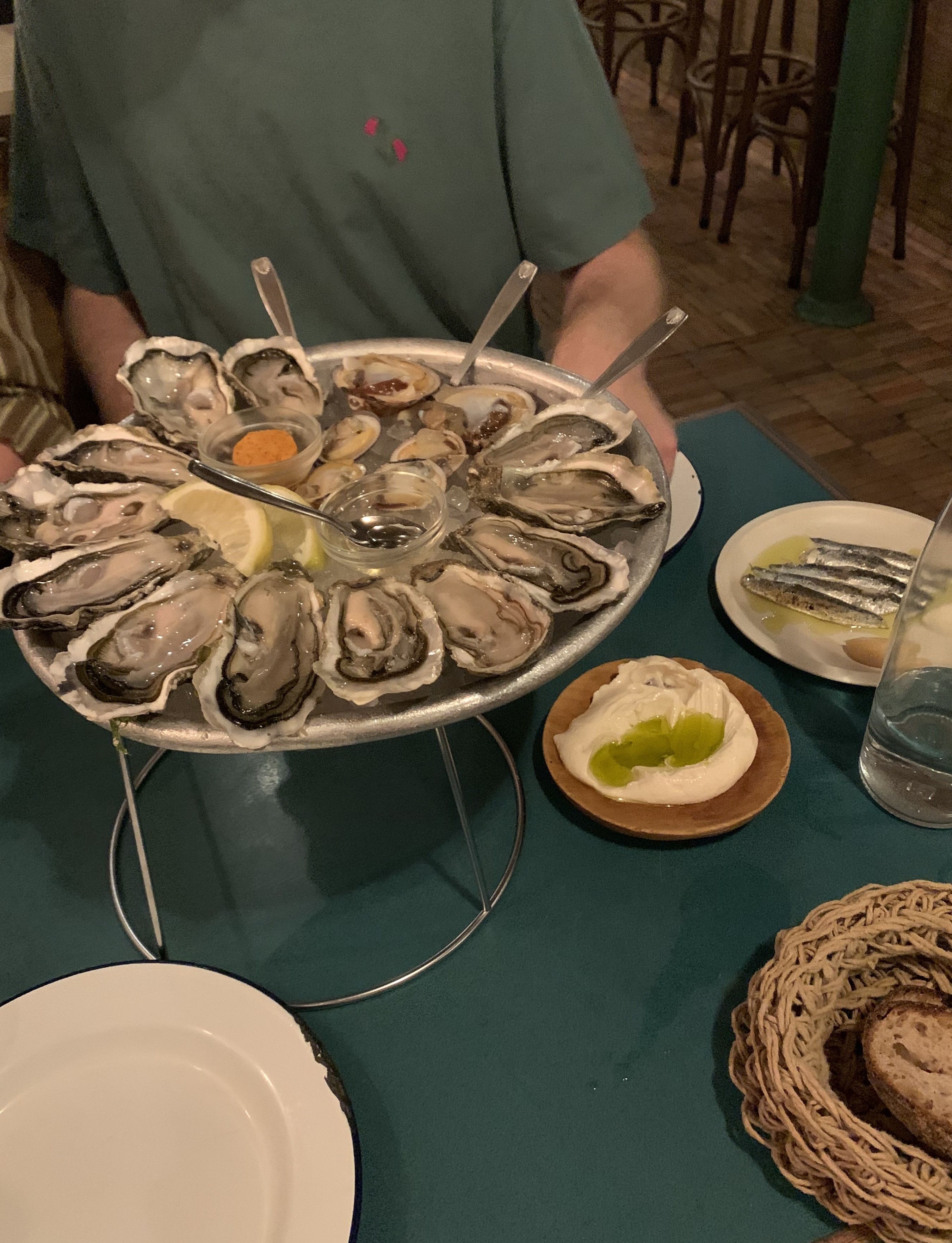 A rustic-chic restaurant in the 11th with a rotating menu of seafood and natural wine. The smoked cod tarama and oyster tower were unforgettable. The place is incredibly popular and fills up fast, but we were seated quickly upon arriving at their 6pm open time. Eating at 6pm is geriatrically early by Paris standards, but it was worth it. 11/10—my favorite meal in Paris.