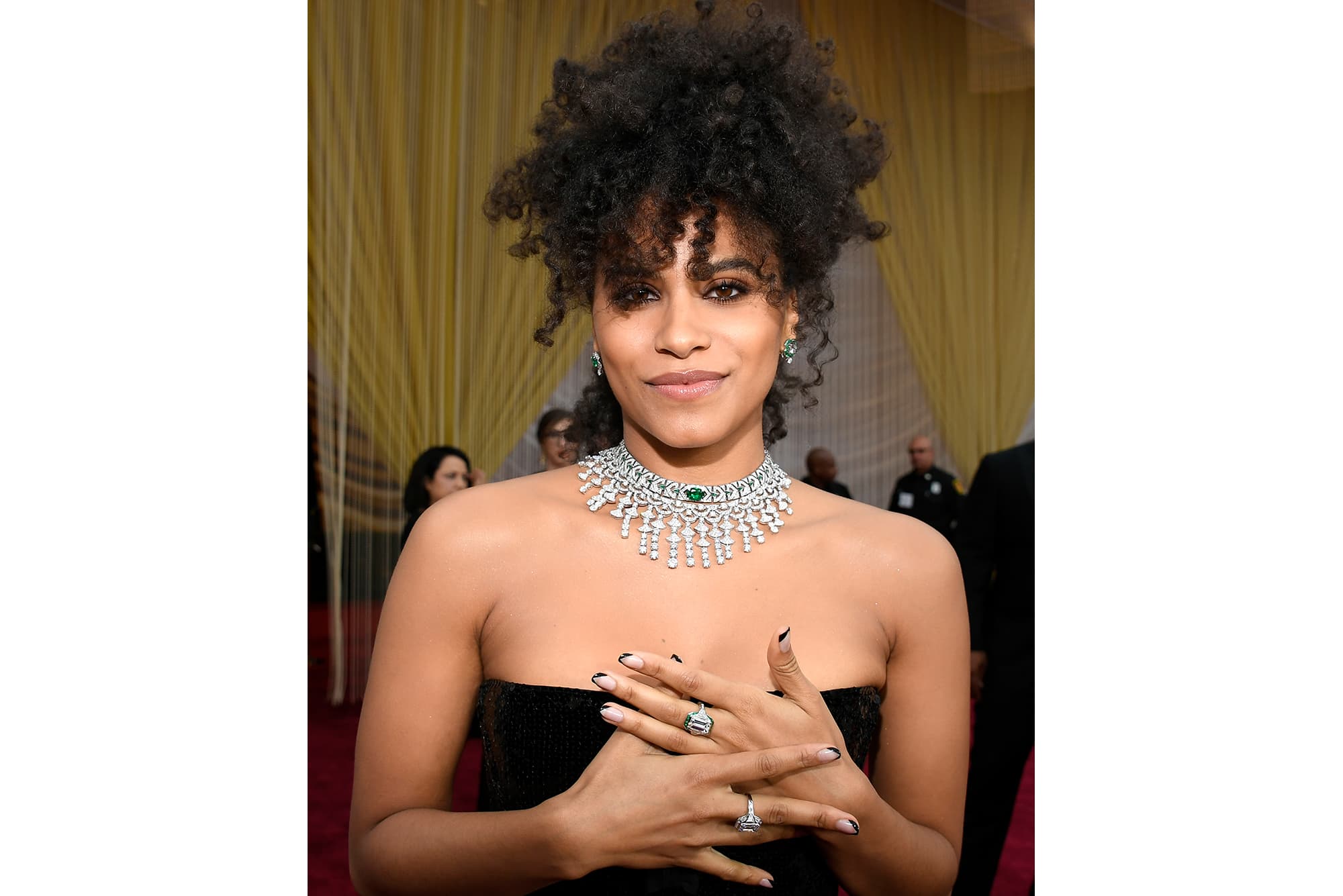 “In a Bulgari diamond necklace, emerald-and-diamond choker, diamond earrings and rings. I love how she is layering the two major necklaces; it’s a modern way to wear jewelry. Doubling down on the glamour. The star is really the 5.48-carat oval emerald in the center of the choker.” —Will Kahn