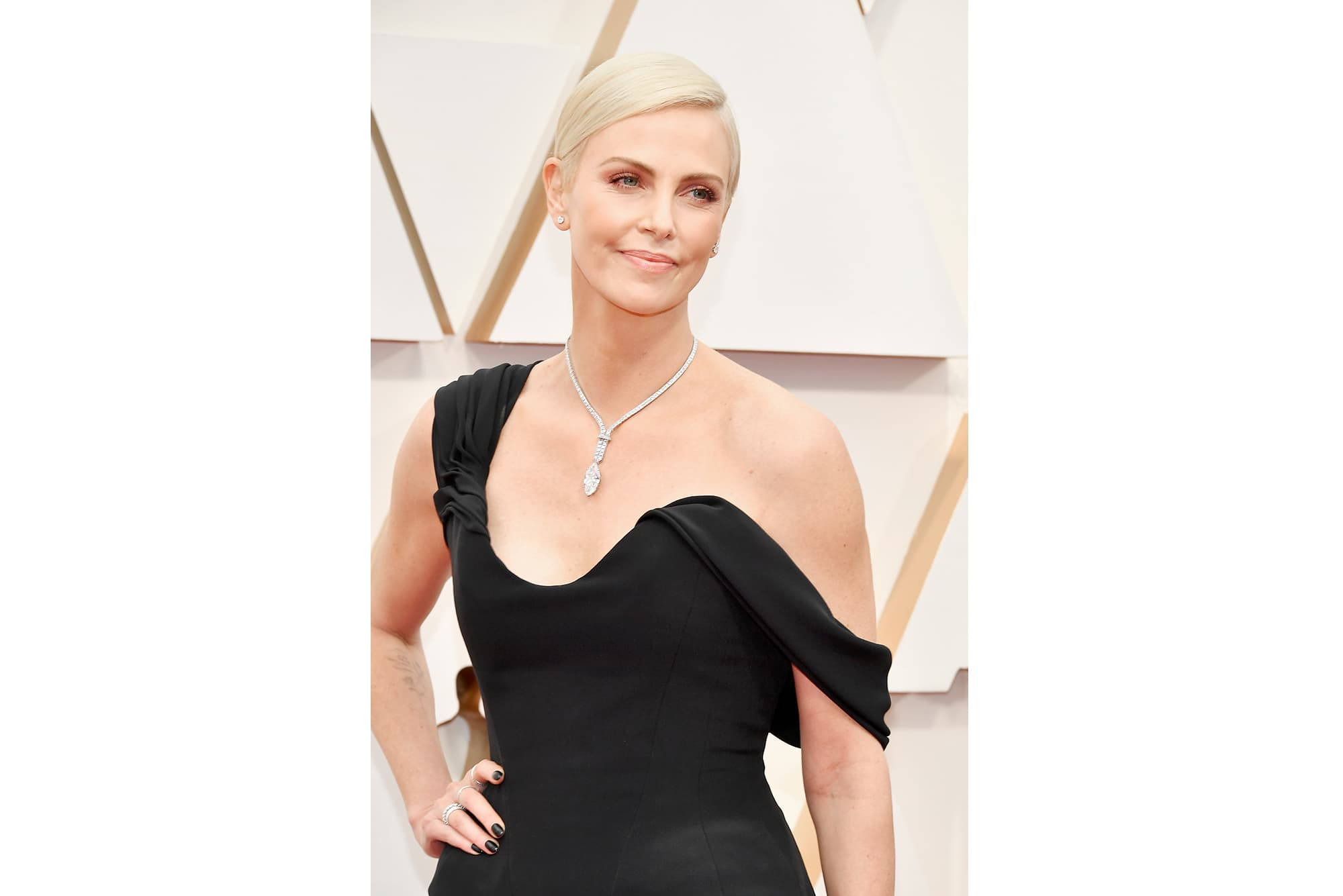 “Charlize Theron always brings the jewels, and tonight is no exception. Her Tiffany & Co necklace culminates in a 20-plus-carat marquise-cut diamond drop.” —WK