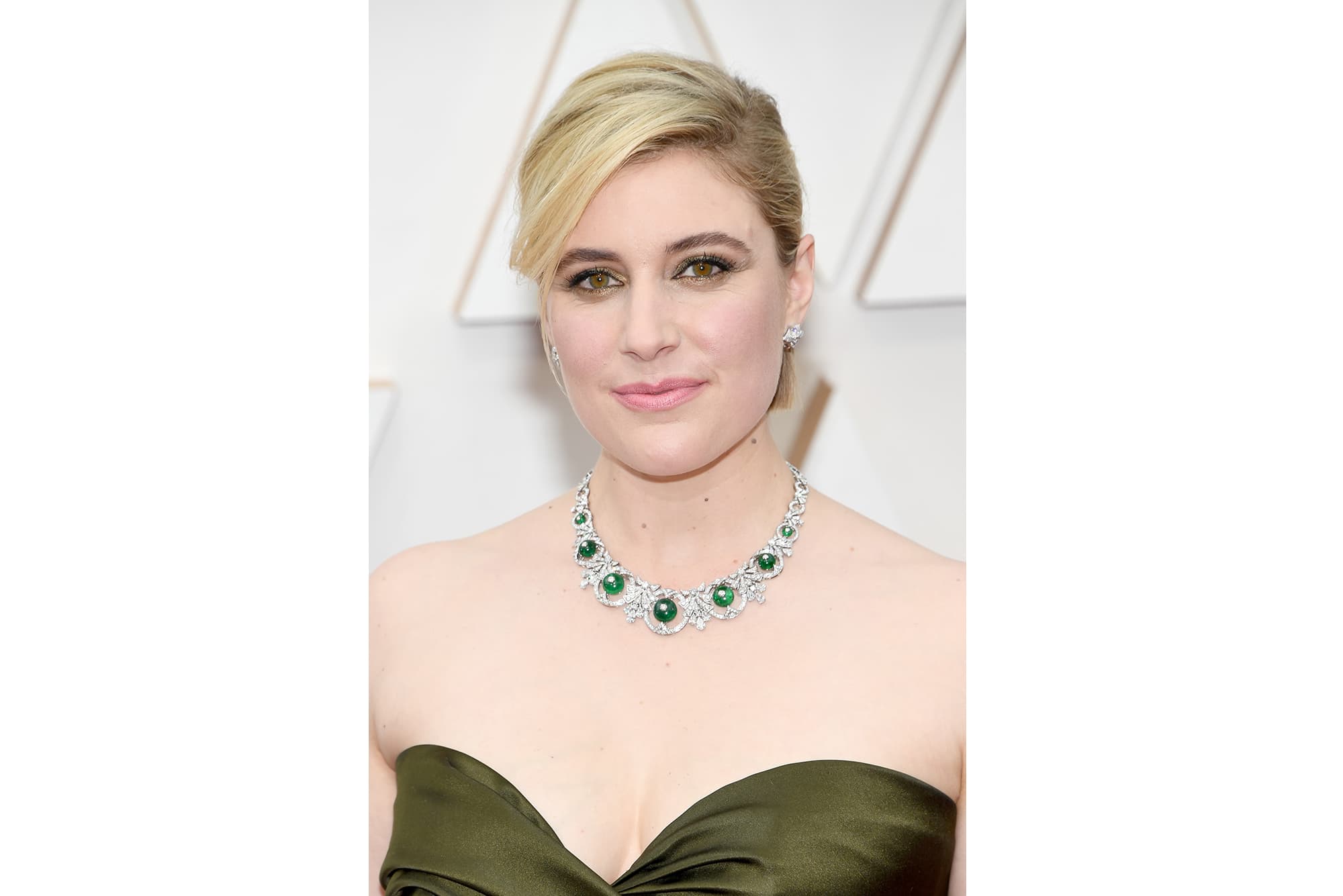 “Though snubbed for a Best Director nomination, she is shining in Old Hollywood glamour tonight in a Bulgari High Jewelry necklace in platinum with seven emerald beads, 14 pear diamonds, 32 round diamonds, and pavé-set diamonds. The Oscars is still the place for true glamour, and she is doing just that.” —WK
