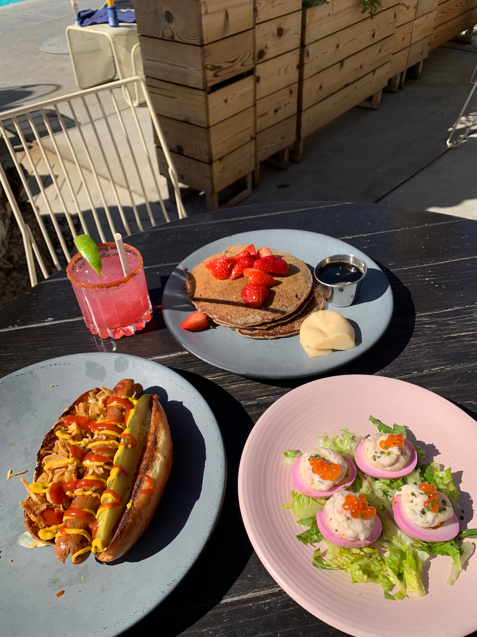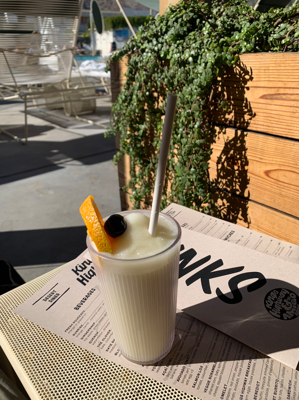 King’s Highway: Attached to the Ace Hotel, the King’s Highway Diner resides in a classically 60s former Denny’s with an authentic mid-century flair. It’s the kind of place you can really cosplay being in one of the California-based episodes of Mad Men (which is always what I’m looking for in Palm Springs). You have the option to eat inside or poolside on the patio. The menu features your typical diner fare–burgers, pancakes, eggs, etc.–alongside an extensive list of drinks. They even offer a date shake, an 80-year-old specialty of the Coachella Valley. I highly recommend the frozen cocktails for a poolside afternoon–the pina colada tastes like a Dole whip, and I had a great time racking up my room tab with these bad boys.
