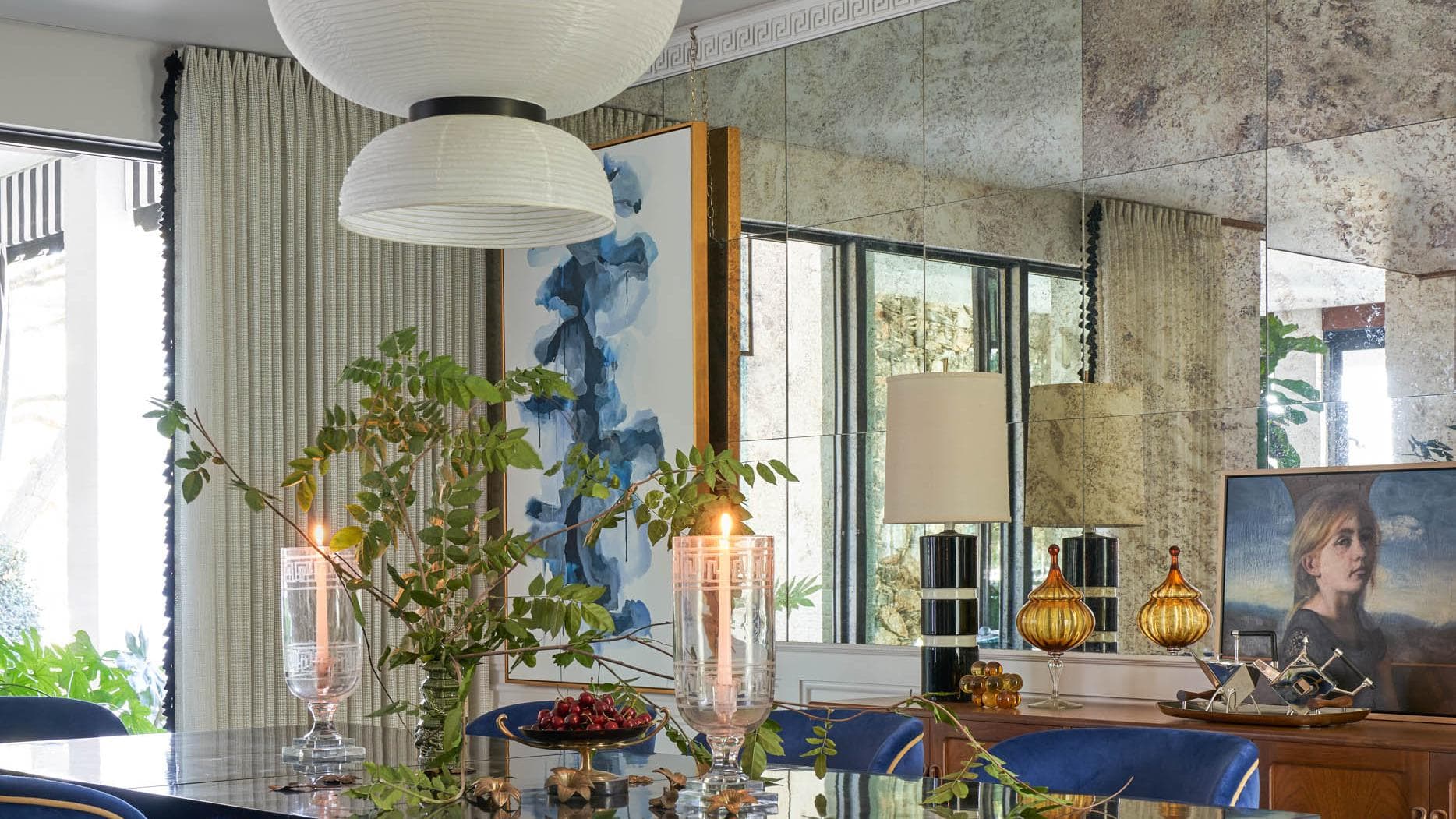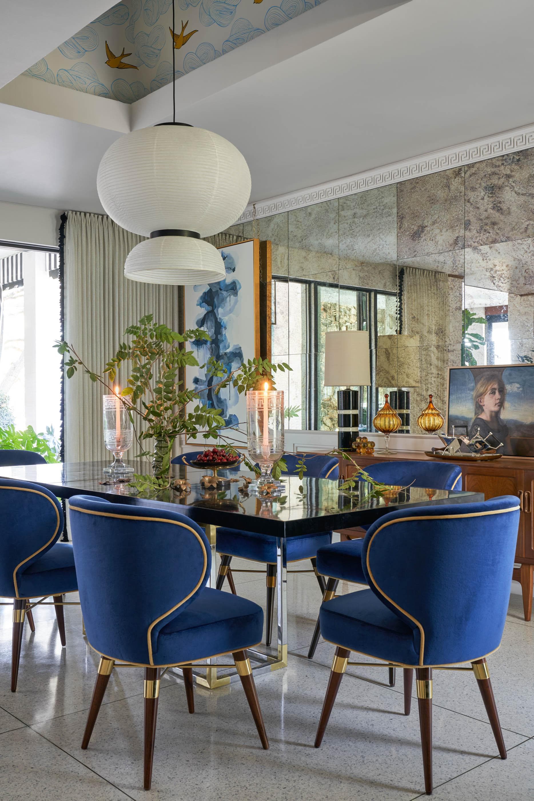 Antiqued Mirror + Modern Glass Table + Blue Dining Chairs
