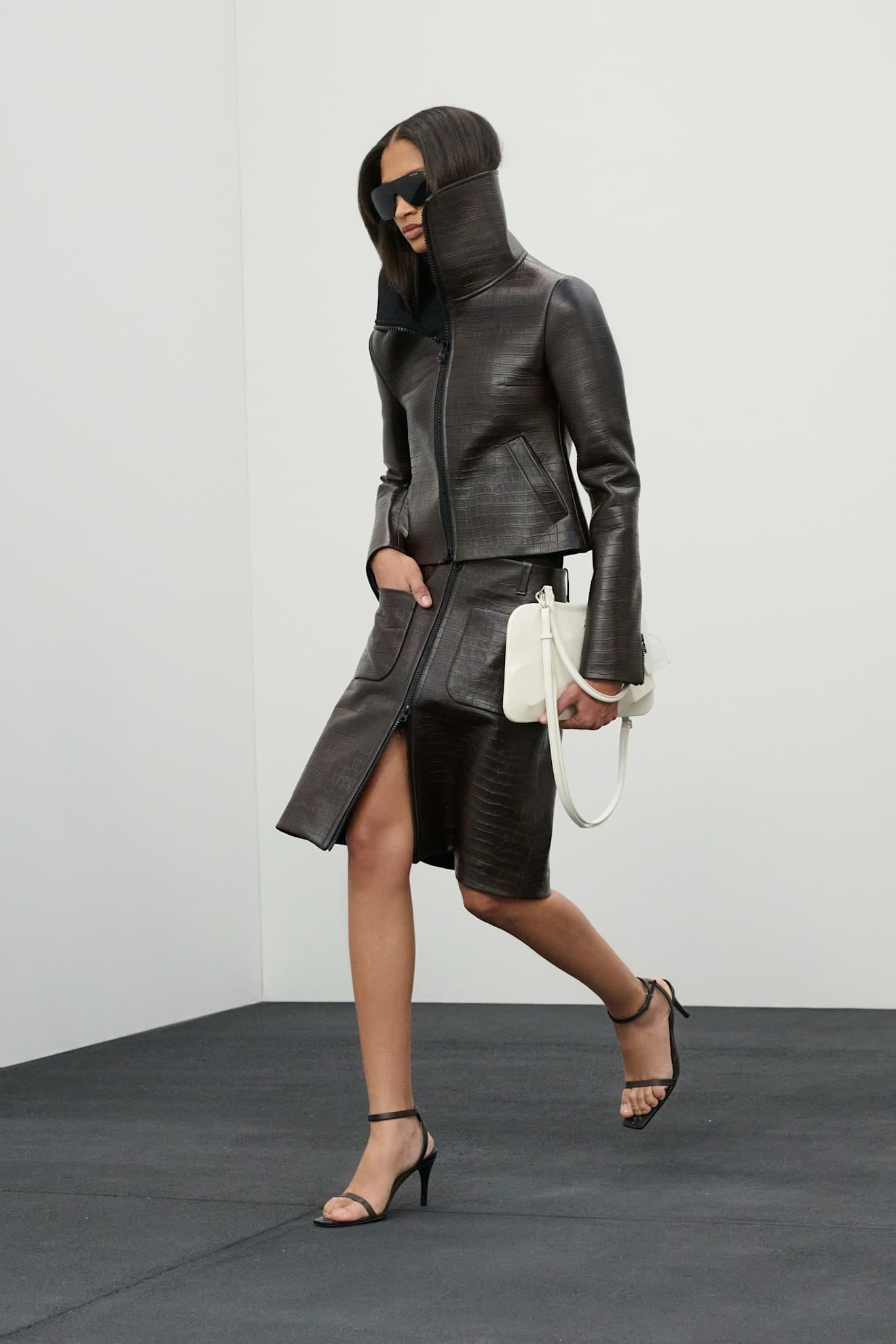 Tom Ford FW26 LaunchmetricsWe've seen a lot of leather this season, but a standout interpretation of otherwise classic silhouettes has been the incorporation of croc-effect leathers for added luxury. At Alaïa, it was best represented in a single breasted, chocolate overcoat, while at Courrèges, it was all about the black croc effect leather two piece with a funnel neck. At Tom Ford, Haider Ackermann kept it simple deep brown jacket with a popped collar and rolled sleeves.