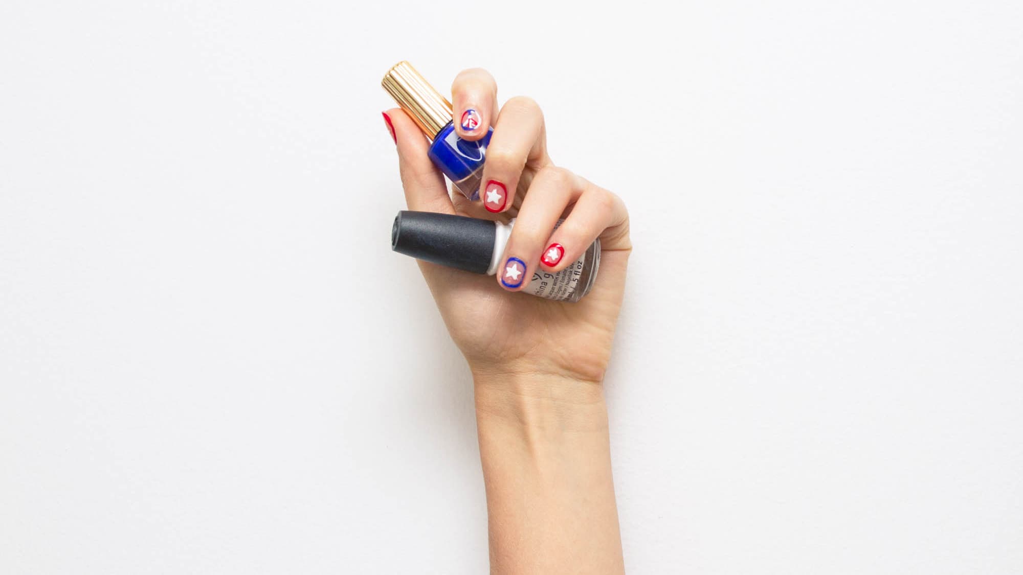 4. Finally, use the nail art brush to paint white stars in the center of your thumb, middle, ring, and pinkie finger. You can also alternate hearts and stars!