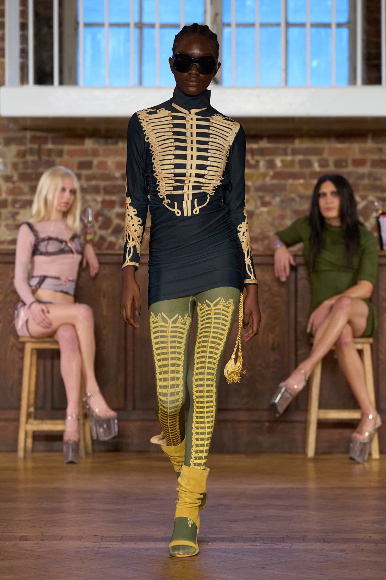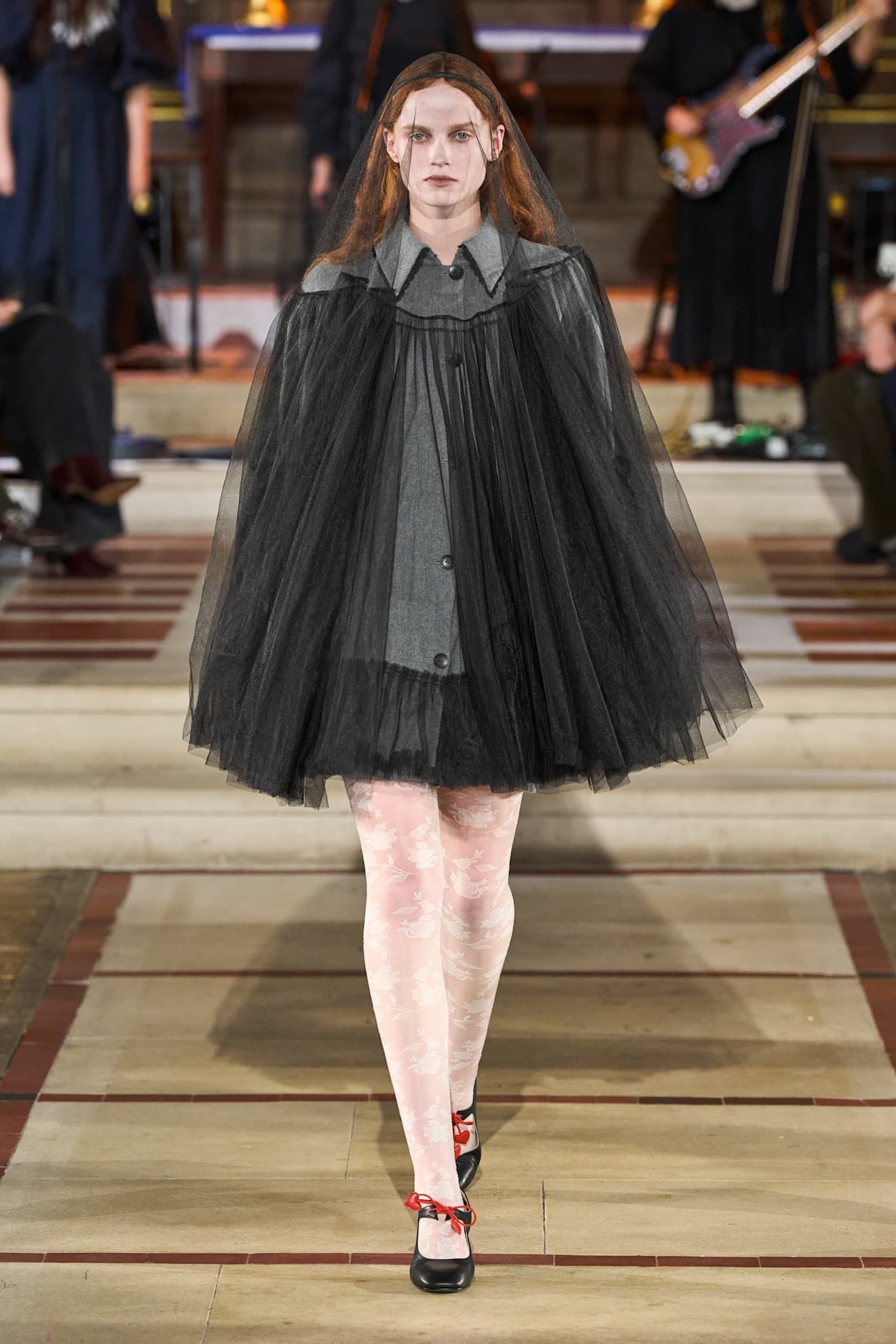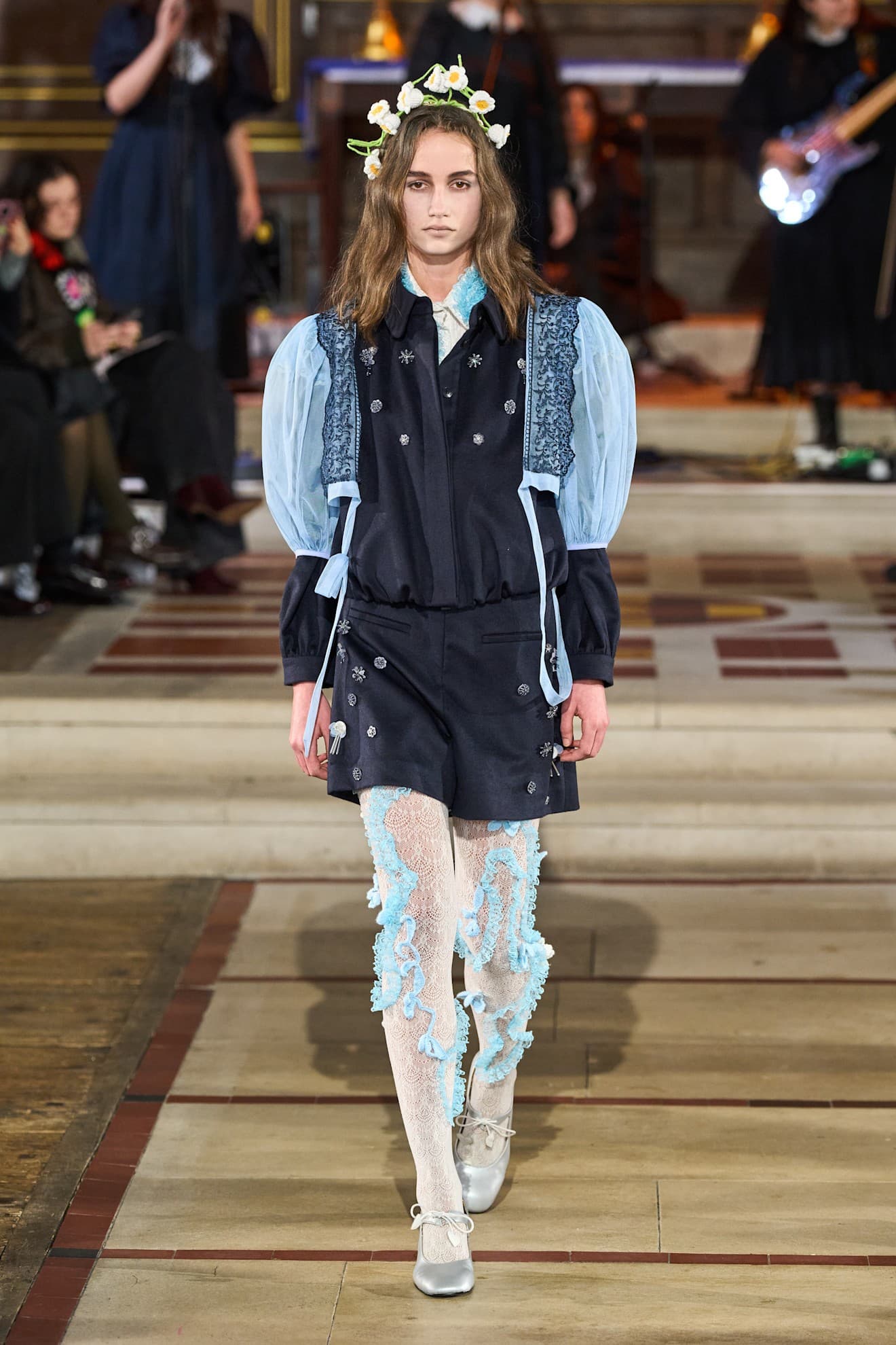 Sinead Gorey Fall/Winter 2026 LaunchmetricsLater on the runway, military jackets were paired with tights that featured drummer-boy military braiding all the way up and pale blue coats were paired with perfectly coordinated pale blue tights. Gorey's runway perfectly demonstrated how a pair of tights can completely change up a look.