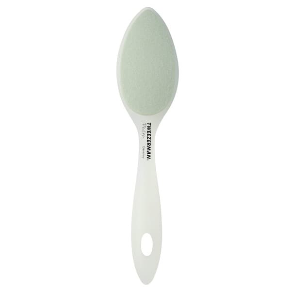 Now that your skin has softened, take a callus stone and really work at the soles of the feet, top of the toes, cracked heels—really, anywhere you may have callused skin. Just be sure to