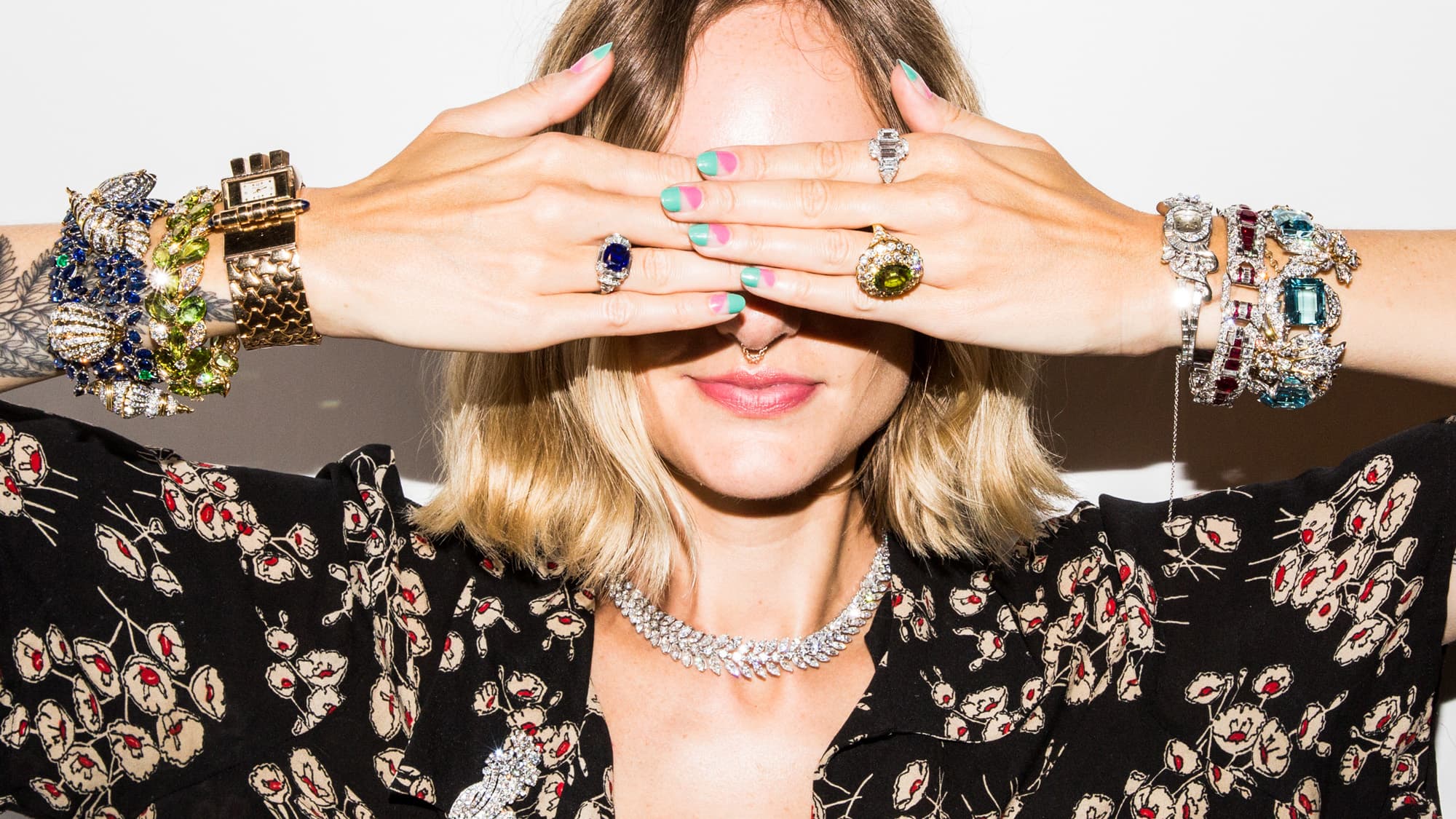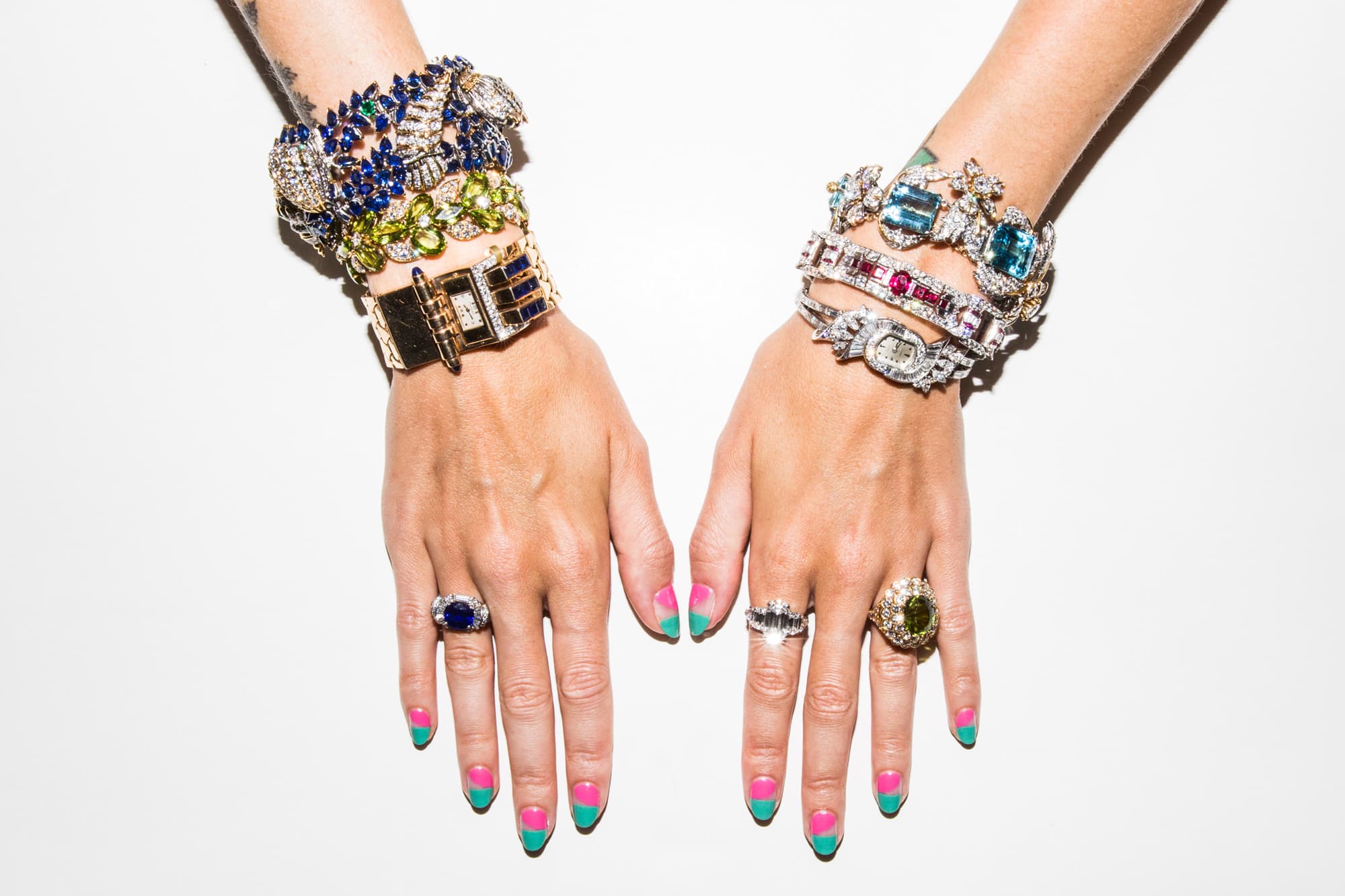 For the next two hours, I stack my arms, ears, fingers, and neck with every combination of jewels I can manage. It’s essentially a fashion girl’s Disneyland, and I am Cinderella. When I grow teary-eyed over a magnificent peridot-and-diamond pendant, the staff informs me that it was Peggy’s favorite. They present several photographs of her wearing it—dancing with her husband at a gala in New York; meeting President George H. W. Bush at the White House. You know, casual stuff. Despite looking like the textbook definition of *extra*, I can feel how sentimental these pieces were to Peggy, with many having been designed just for her, like the aquamarine
