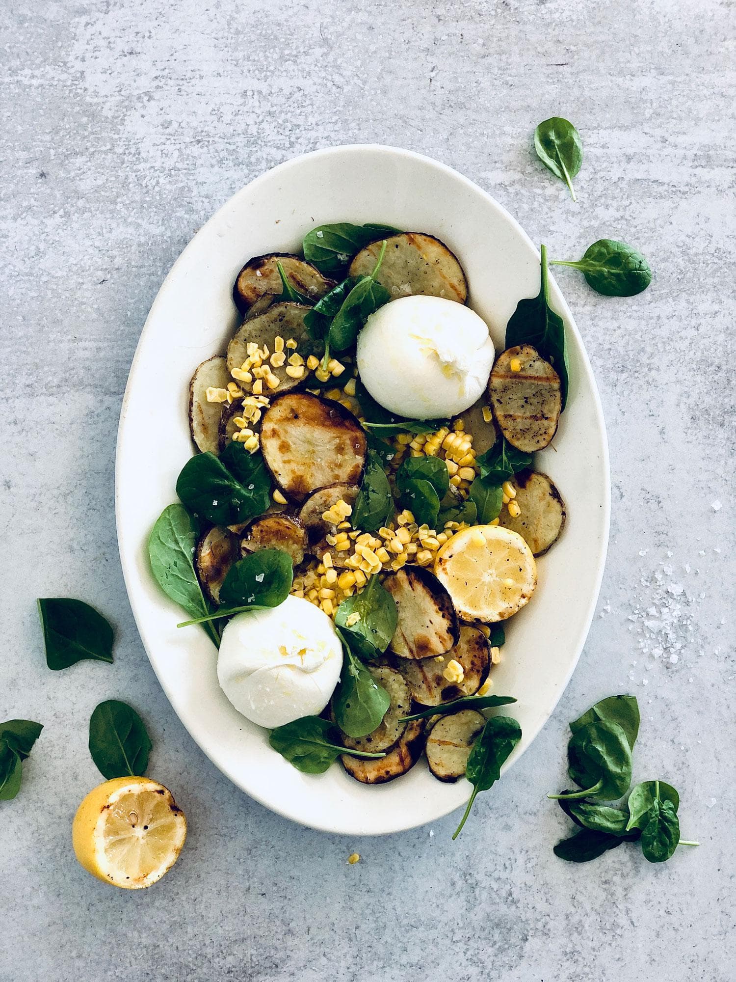 To serve: On a platter, arrange potato, corn, and spinach and add burrata balls. Squeeze grilled lemon juice all atop, and finish with 2 tbsp olive oil and honey. Finish with chili flakes (if using) and fleur de sel.